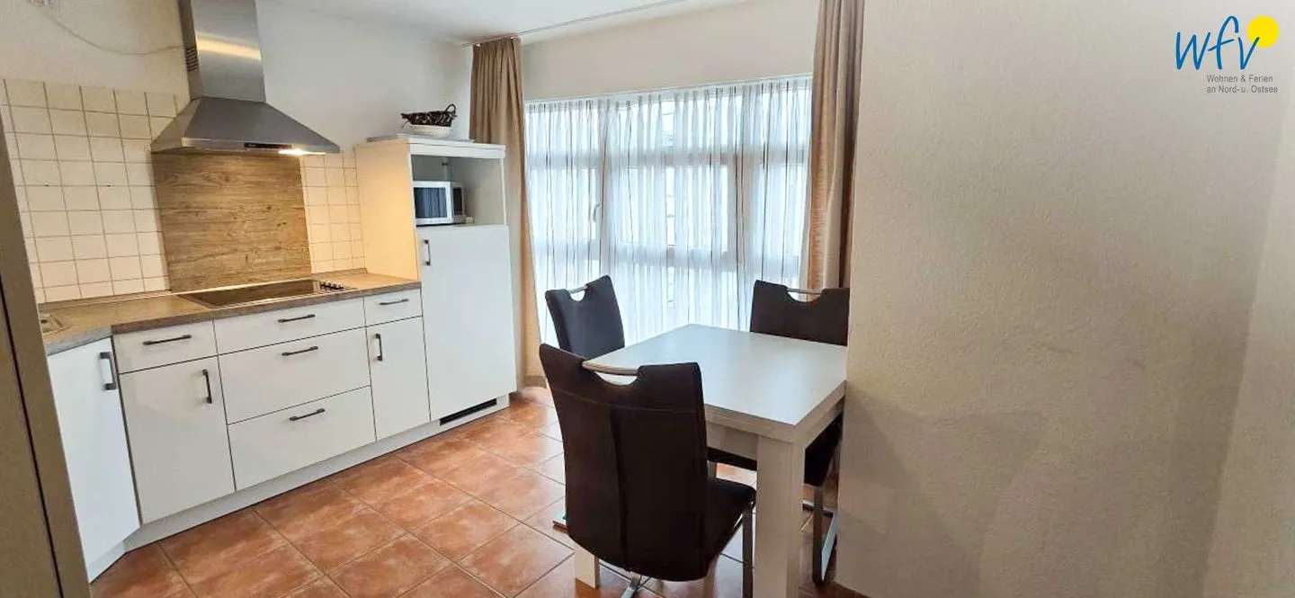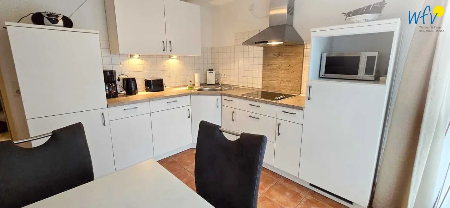 Für eine bequeme Selbstverpflegung steht Ihnen eine geschlossene vollausgestattete Küche zur Verfügung - u.a. mit Herd, Backofen, Mikrowelle und Spülmaschine sowie diversen Kleingeräten. So lassen sich schnell und einfach Snacks für den Ausflug oder leckere Gerichte zubereiten. Ein Esstisch bietet Platz zum Klönen, für das Urlaubsfrühstück oder das gemeinsame Abendessen.