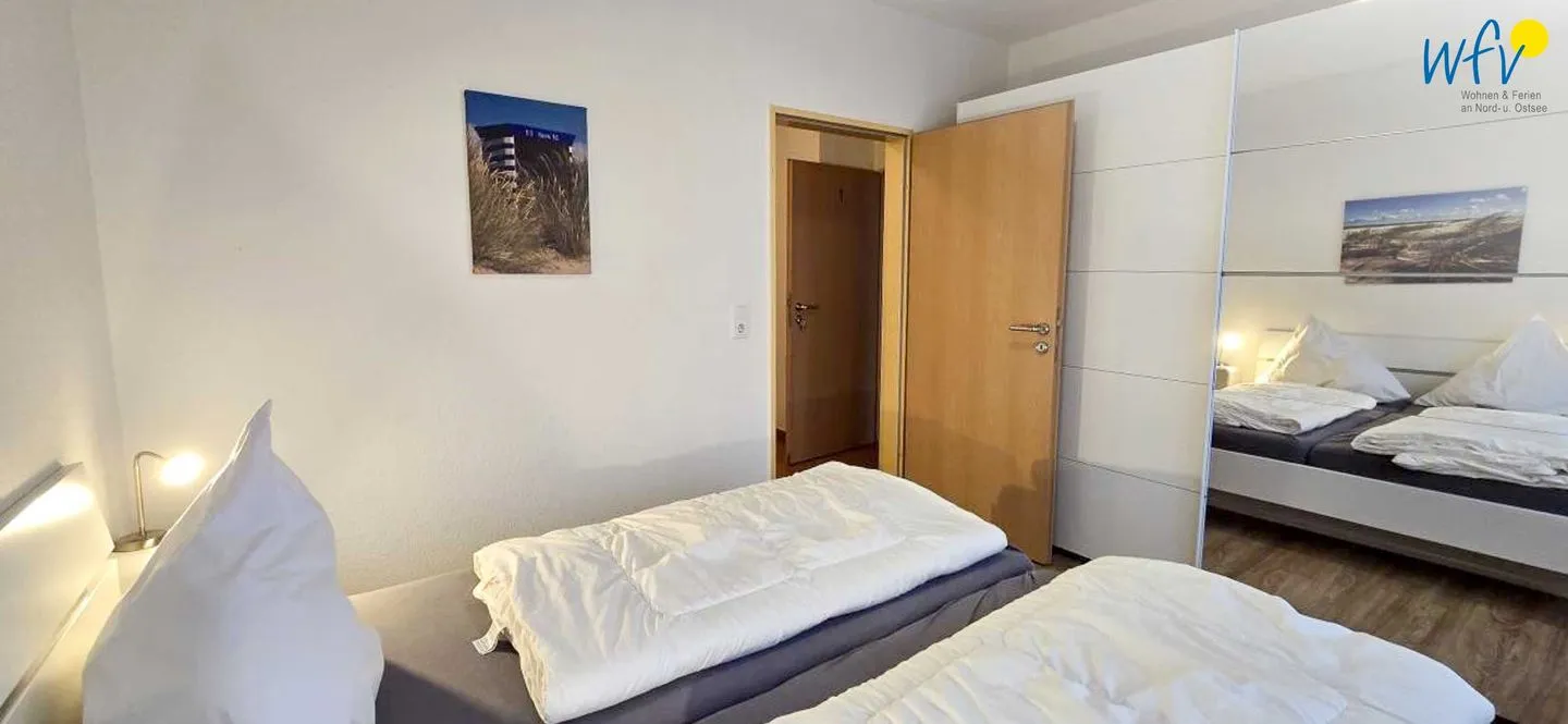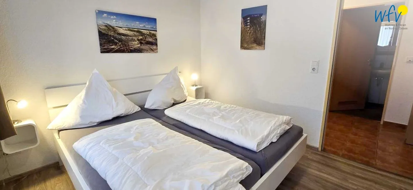 Das separate Schlafzimmer ist mit einem Doppelbett (200 x 200 cm) und einem geräumigen Kleiderschrank für Ihre Urlaubsgarderobe eingerichtet.