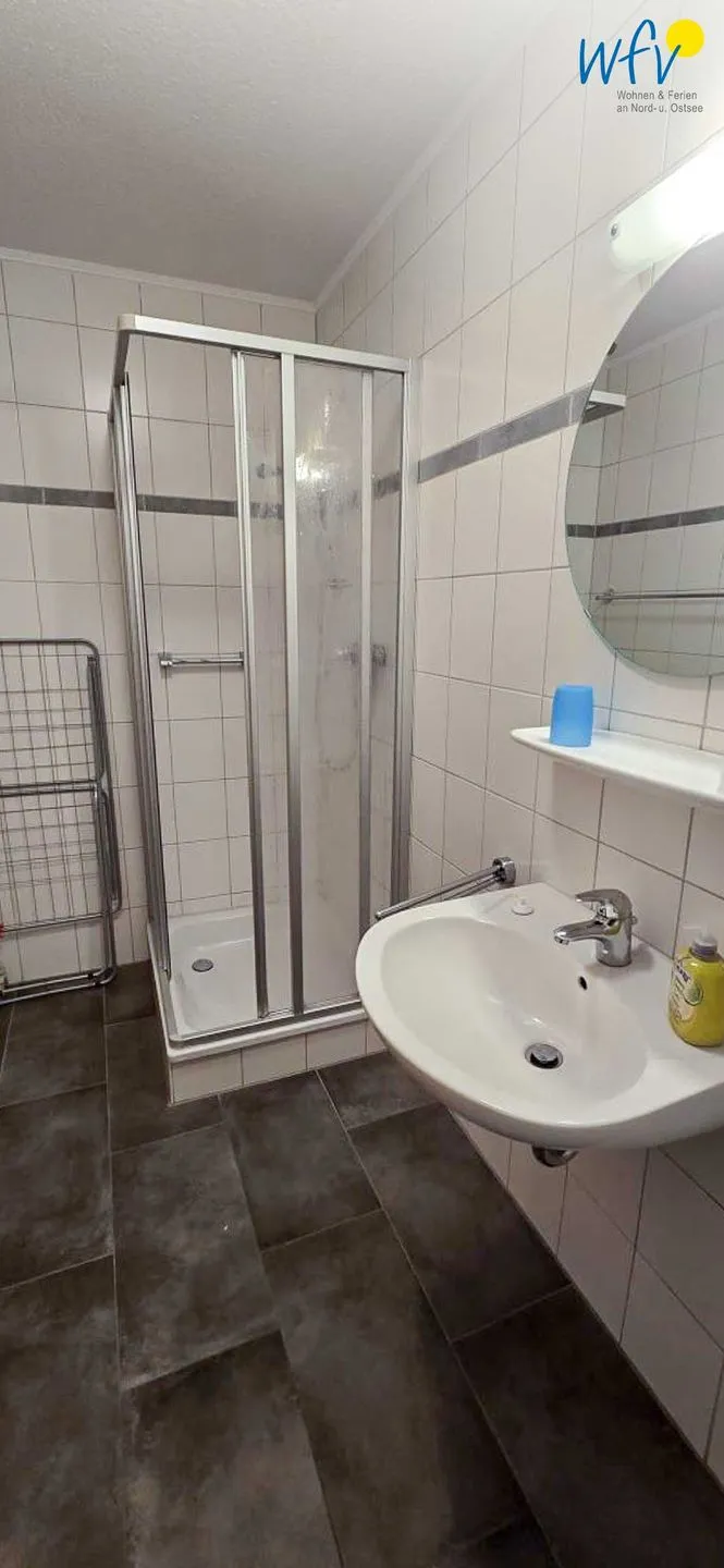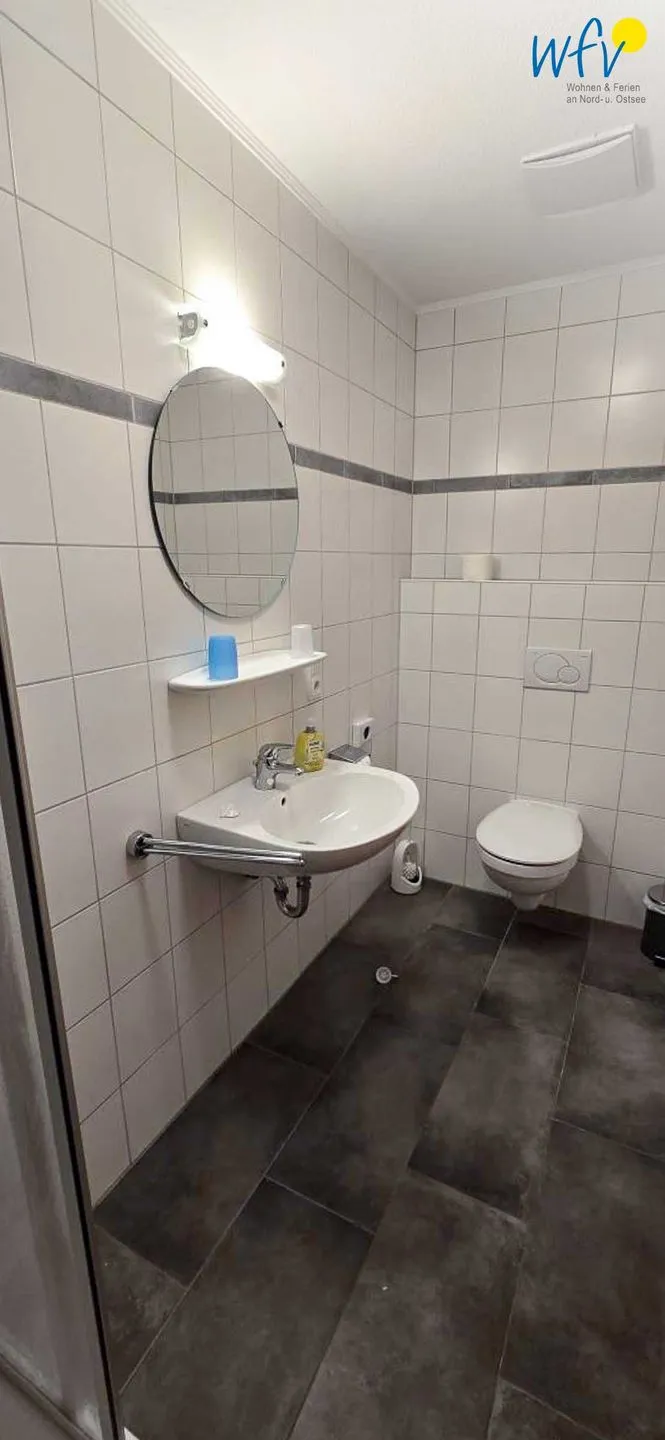 Das gepflegte Badezimmer mit Dusche, WC, Waschbecken, Haartrockner und einem Spiegel sorgt für weiteren Komfort.