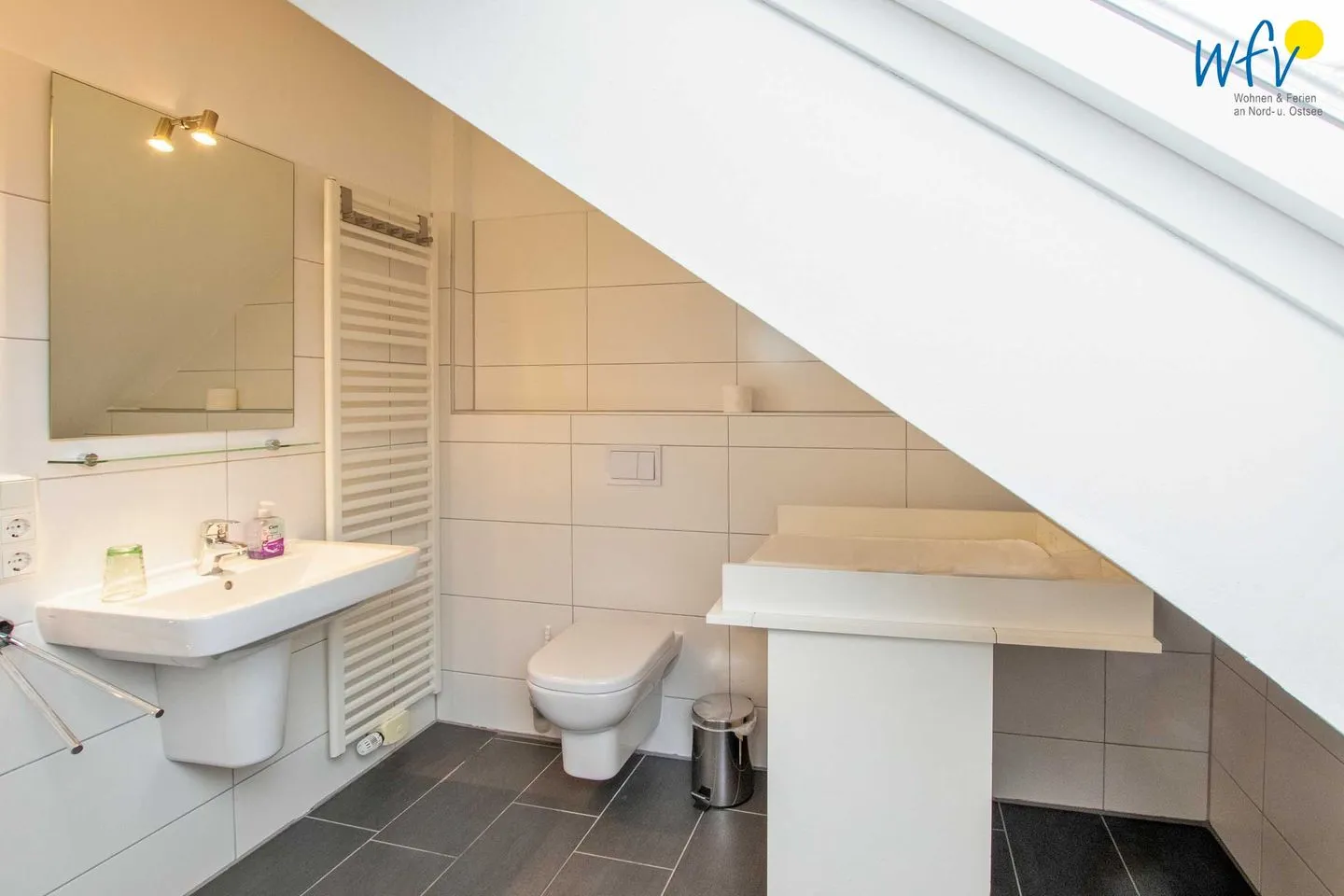 Zwei moderne Tageslichtbäder sowie ein zusätzliches Gäste-WC (EG) ermöglichen eine entspannte Nutzung bei einem Urlaub mit mehreren Personen. Das Bad im OG ist mit zwei Waschtischen, WC und Dusche ausgestattet, in dem Bad im DG befinden sich ebenfalls eine Dusche und ein WC sowie Waschmaschine und Trockner.