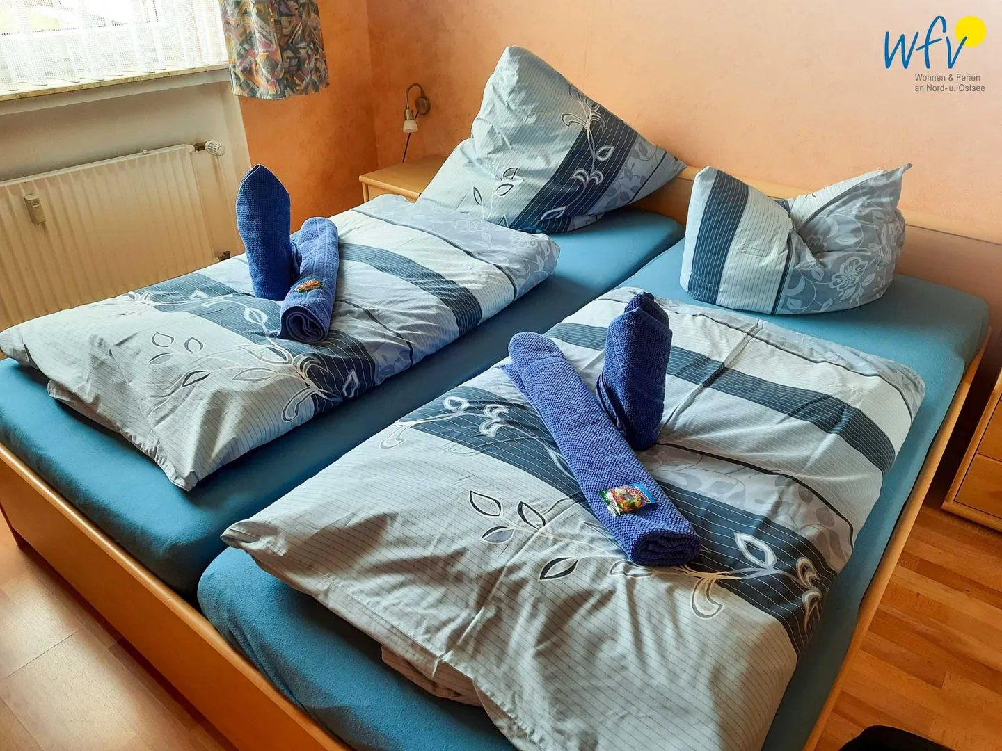 Im gemütlichen Schlafzimmer befinden sich ein Doppelbett (1,80 x 2 m) mit offenem Fußteil und zwei Nachtschränkchen sowie ein großer Kleiderschank mit Spiegelfront. Schlaf- und Wohnzimmer können mit einer Gardine verdunkelt werden. Für unsere kleinen Gäste gehören ein Babybett und ein Hochstuhl zum festen Inventar.