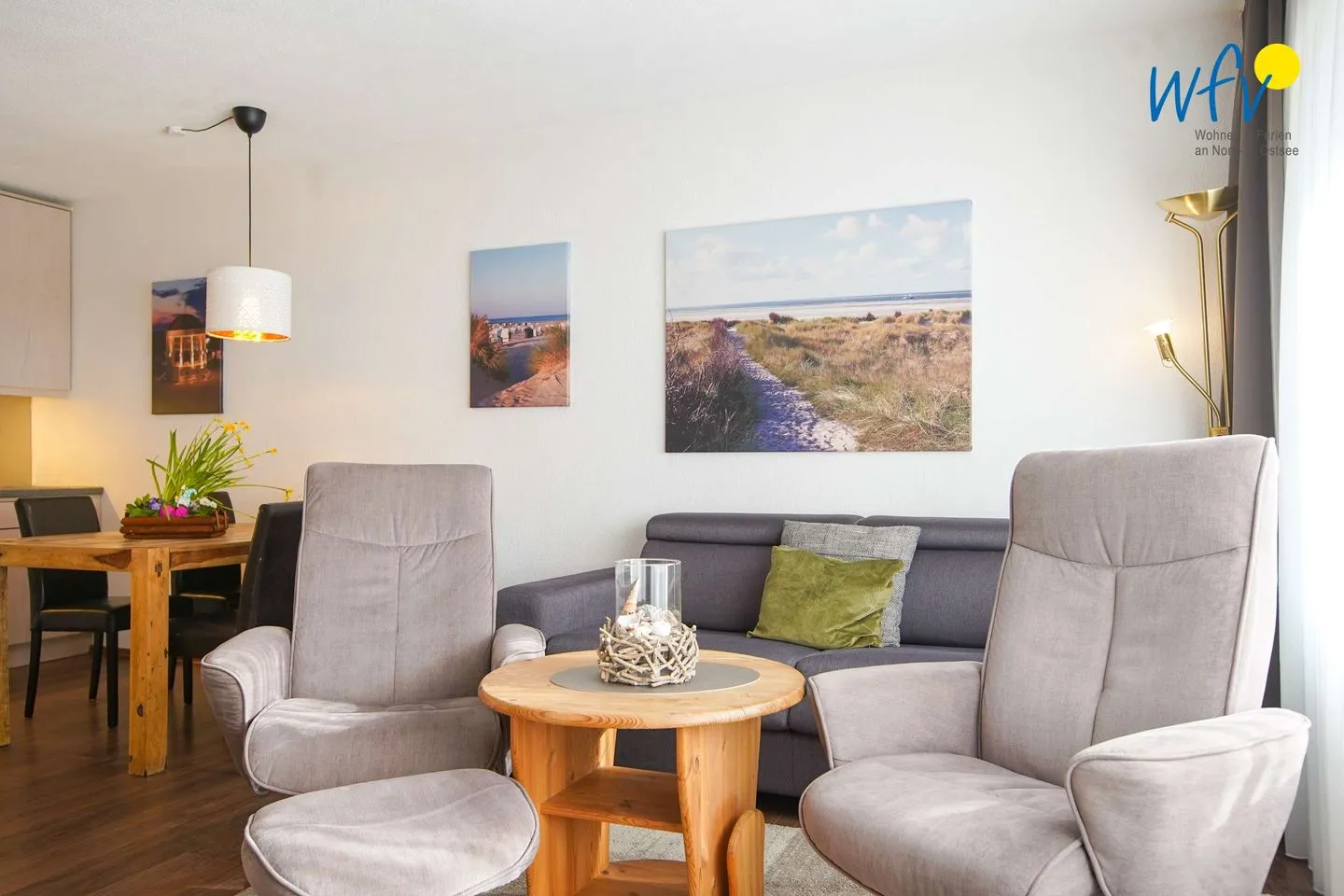 Die 35 m² große Unterkunft bietet Platz für drei Personen und ist damit ideal für entspannte Tage als Paar oder mit der kleinen Familie. Sie verfügt über einen geräumigen Wohnbereich mit integrierter Küche, Essplatz und Couchecke sowie über ein Duschbad. Wohltuende Nordseeluft genießen Sie auf dem Balkon.