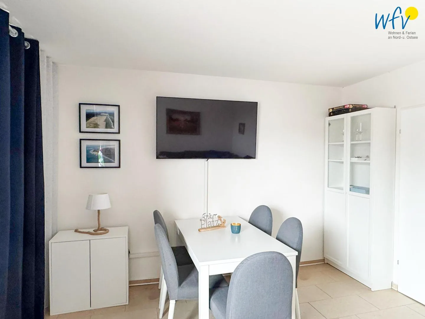 Die Ferienwohnung erstreckt sich über zwei Etagen (1. OG + DG) und verfügt über helle Räume und eine freundliche Atmosphäre. Die Böden sind mit schönem Vinyl ausgelegt, der sowohl Komfort als auch einfache Pflege garantiert. Das helle und geräumige Wohnzimmer im OG lädt dazu ein, den Abend mit einem Film oder einem gemeinsamen Spiel zu verbringen. Hier erwartet Sie eine gemütliche Sofaecke und ein Relaxsessel sowie ein modernes TV und ein CD-Spieler. Zum Surfen vom Smartphone aus empfangen Sie freies WLAN.