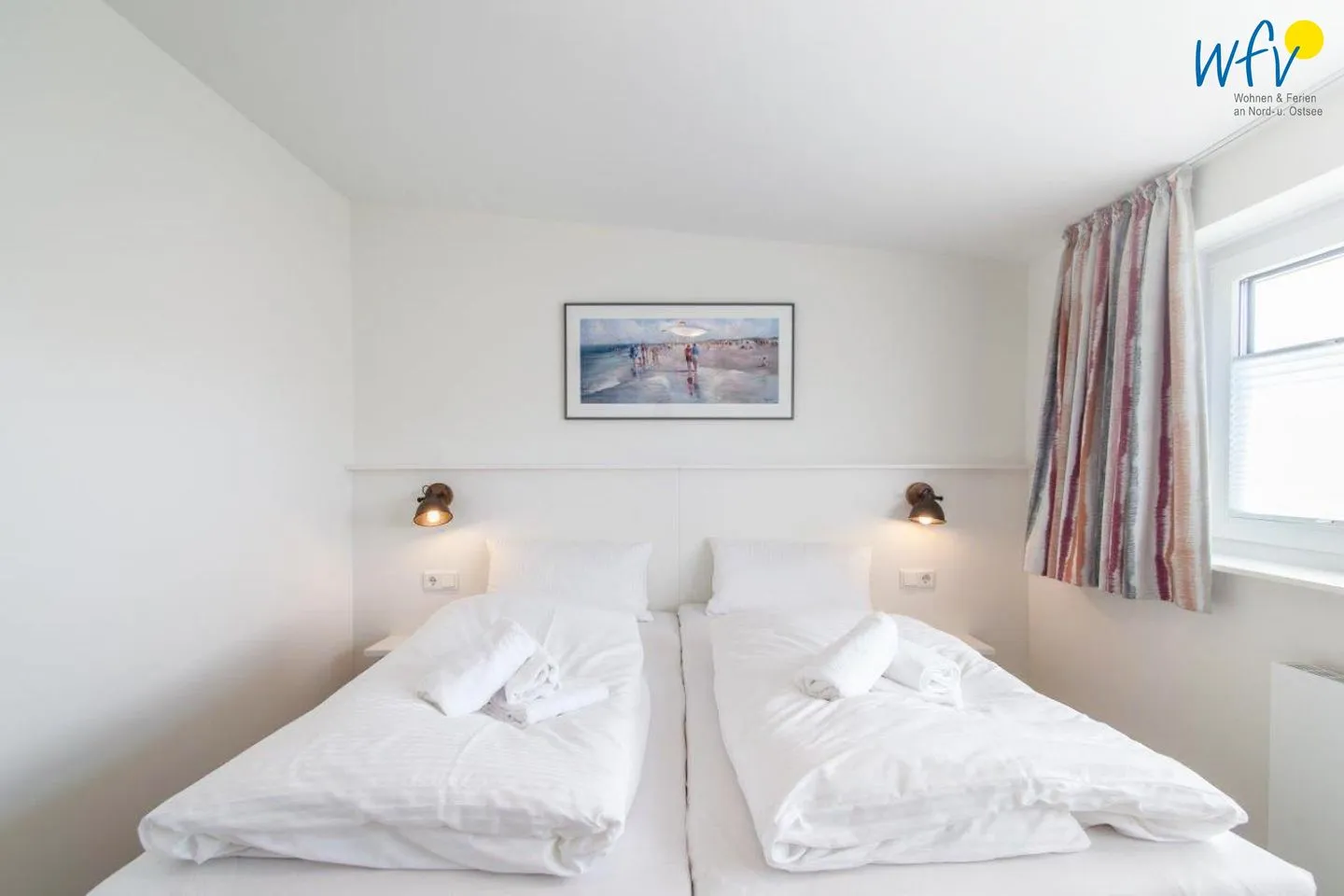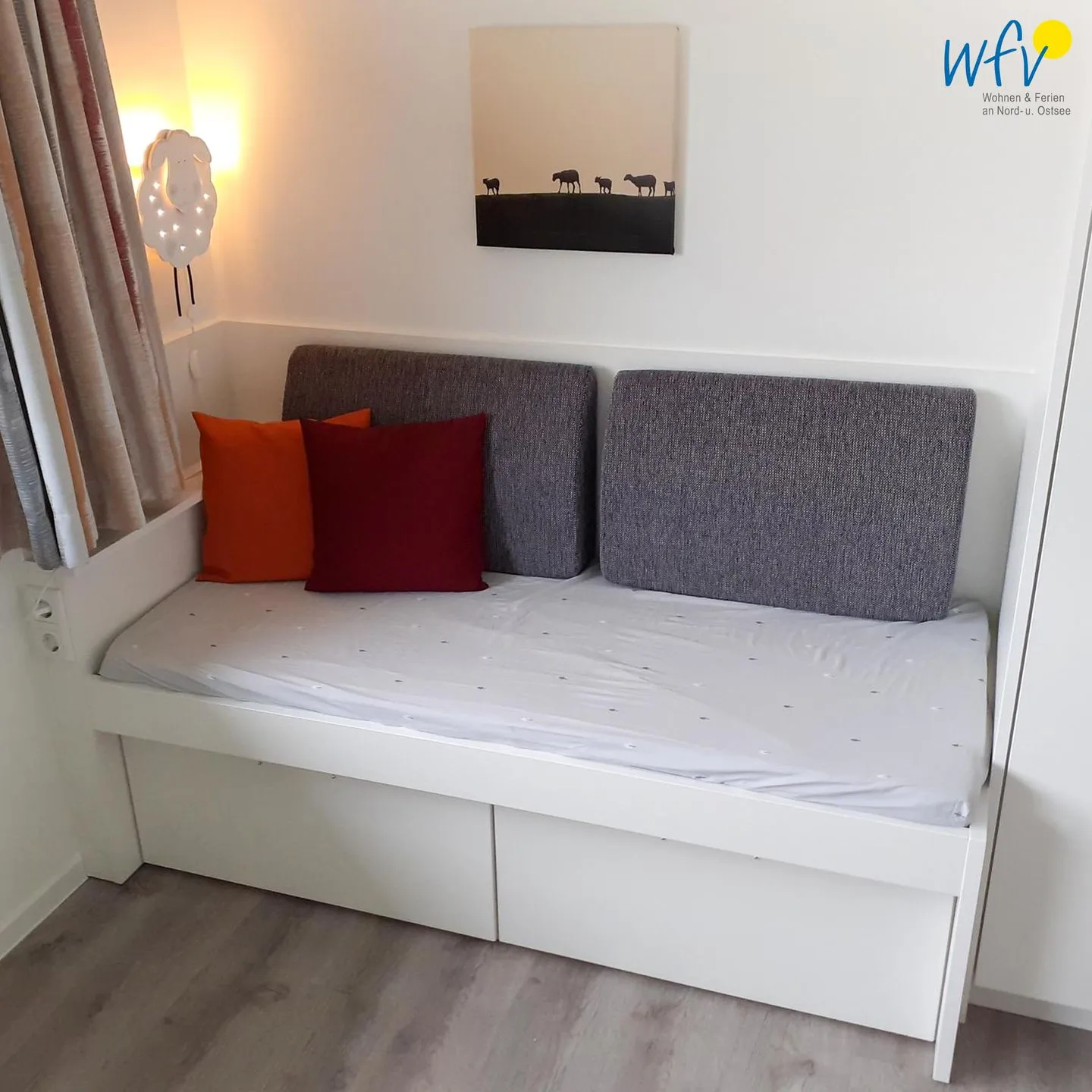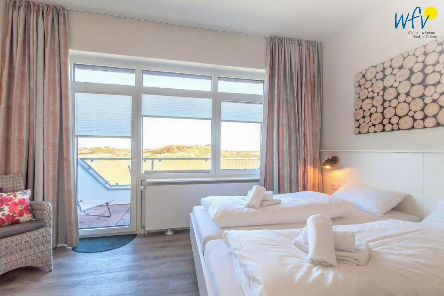 Eine Wendeltreppe führt zu den zwei separaten Schlafzimmern im Obergeschoss. Eines der Zimmer ist mit Doppelbett (180 x 200 cm) und kleiner Sitzecke ausgestattet. Dieser Raum besticht durch seine Panoramafensterfront mit einem traumhaften Blick in die Langeooger Dünenwelt. Genießen Sie vom angrenzenden möblierten Balkon die Luft und die Landschaft samt wunderschönen Sonnenaufgängen - sogar das Meer hören Sie hier rauschen! In dem anderen Schlafzimmer zur Gartenseite hin befindet sich neben dem Doppelbett (180 x 200 cm) ein Kinderbett für unsere kleinen Nordseeurlauber (120 x 70 cm). Die Schlafcouch im Wohnzimmer kann zu einem komfortablen kleinen Doppelbett umfunktioniert werden (160 x 200 cm).