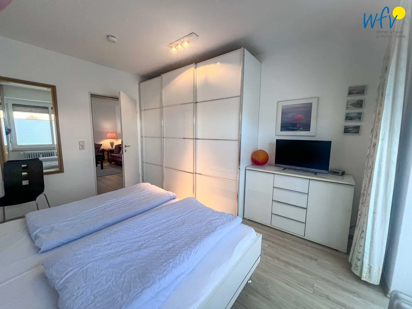 Wenn auf Langeoog die Sonne untergeht, bieten Ihnen zwei separate Schlafzimmer einen wohligen Rückzugsort. Das Elternschlafzimmer ist mit einem Doppelbett ausgestattet (180 cm x 200 cm), das Kinderzimmer mit zwei Einzelbetten (je 90 x 190 cm). Für Ihre Urlaubsgarderobe sind geräumige Kleiderschränke vorhanden, zudem befindet sich im Elternschlafzimmer ein TV.
