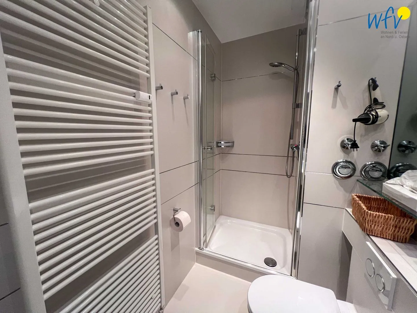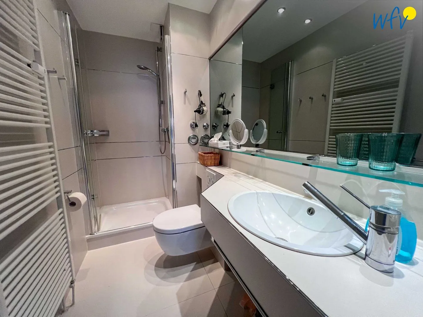 Für zusätzlichen Wohnkomfort sorgt das elegante Badezimmer mit Dusche, breitem Waschtisch, großem Spiegel sowie Kosmetikspiegel, Föhn und Handtuchheizung.