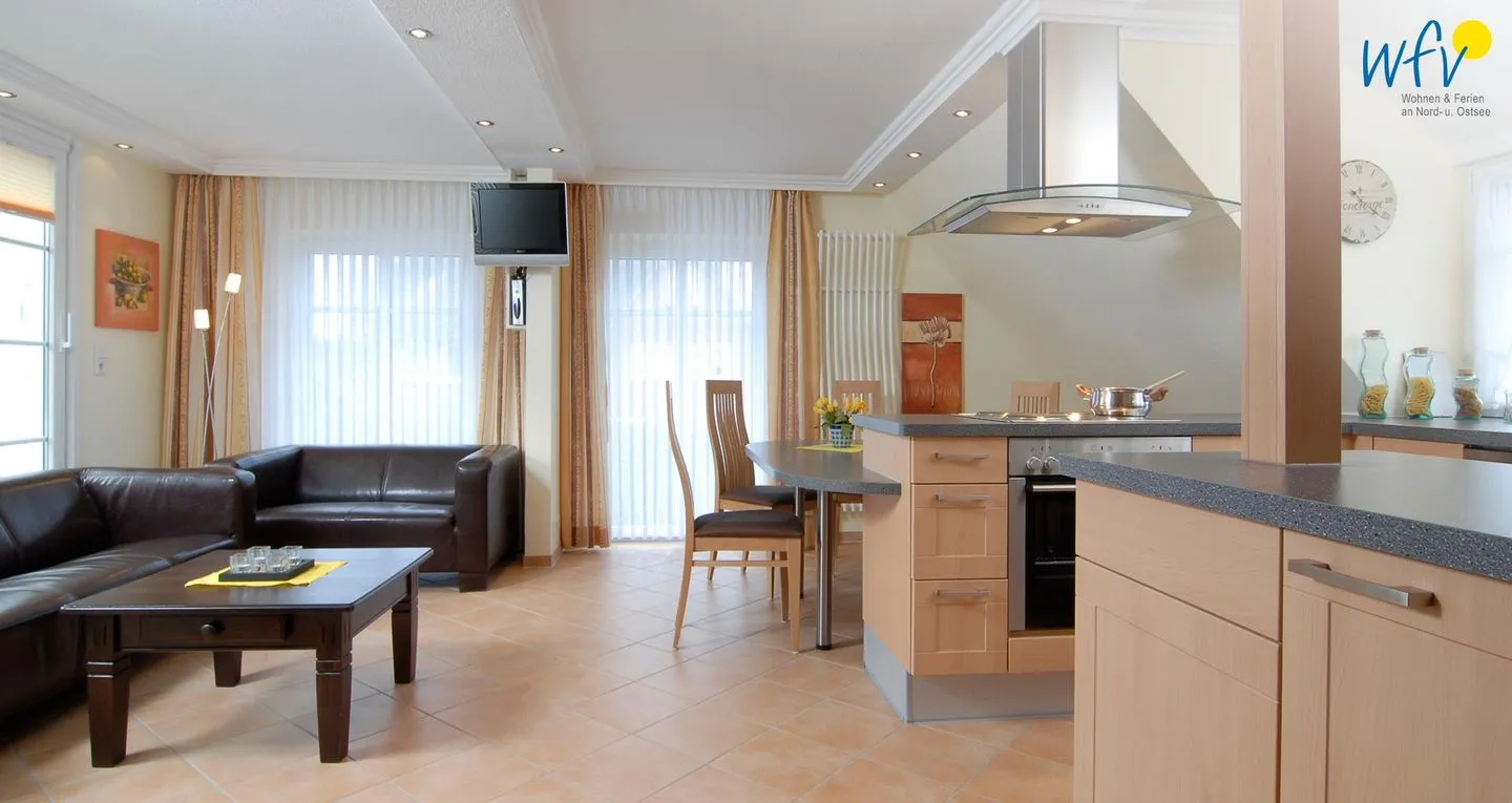 Nach der Fahrradtour oder dem Strandtag lädt der großzügige und offen gehaltene Wohn-/Essbereich zu gemütlichen Stunden mit der Familie ein. Hier können Sie wunderbar gemeinsam kochen, klönen oder fernsehen.