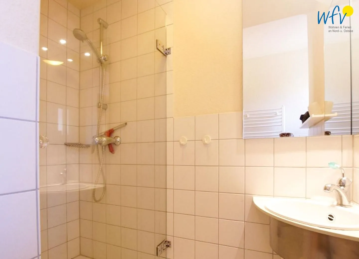 Das gepflegte Tageslichtbad mit Dusche ergänzt den Wohnkomfort.