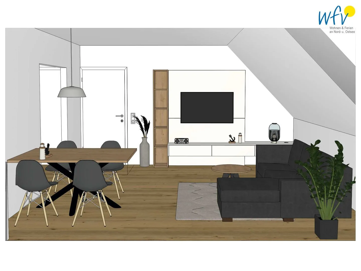 Großzügige 80 m² Wohnfläche über zwei Etagen (DG + SP) bieten ein weites Raumgefühl und viel Platz für Ihren Urlaub mit bis zu vier Personen. Der helle Wohnbereich mit Couchecke und modernem SmartTV lädt nach dem Strandspaziergang zur Entspannung ein. Auch das Schlafzimmer im Spitzboden ist mit einem TV ausgestattet, perfekt für gemütliches Fernsehen vom Bett aus. An dem gemütlichen Holzesstisch können lange und gesellige Abende verbracht werden mit einem ausgiebigen gemeinsamen Essen oder einem Spiel aus der Spielebox.