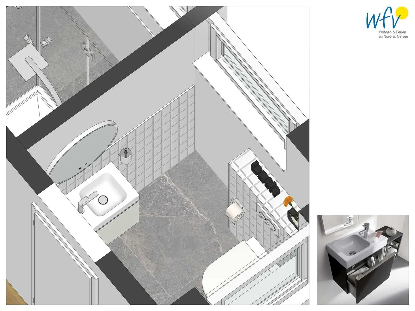 Das elegante Tageslichtbad mit ebenerdiger Dusche lädt zur Erfrischung nach dem Strandtag ein. Ein separates WC entspannt die täglichen Badezimmerroutinen.
