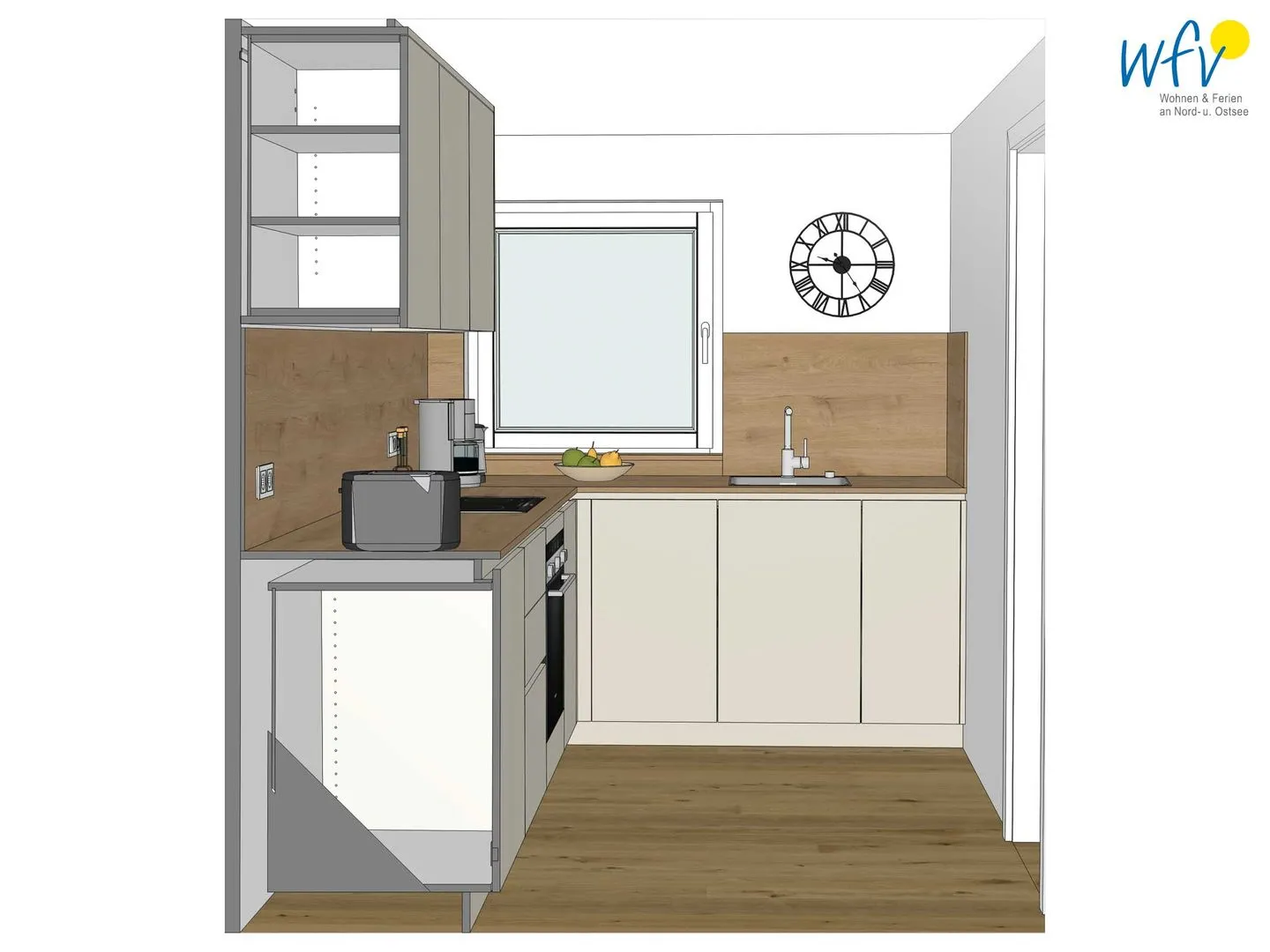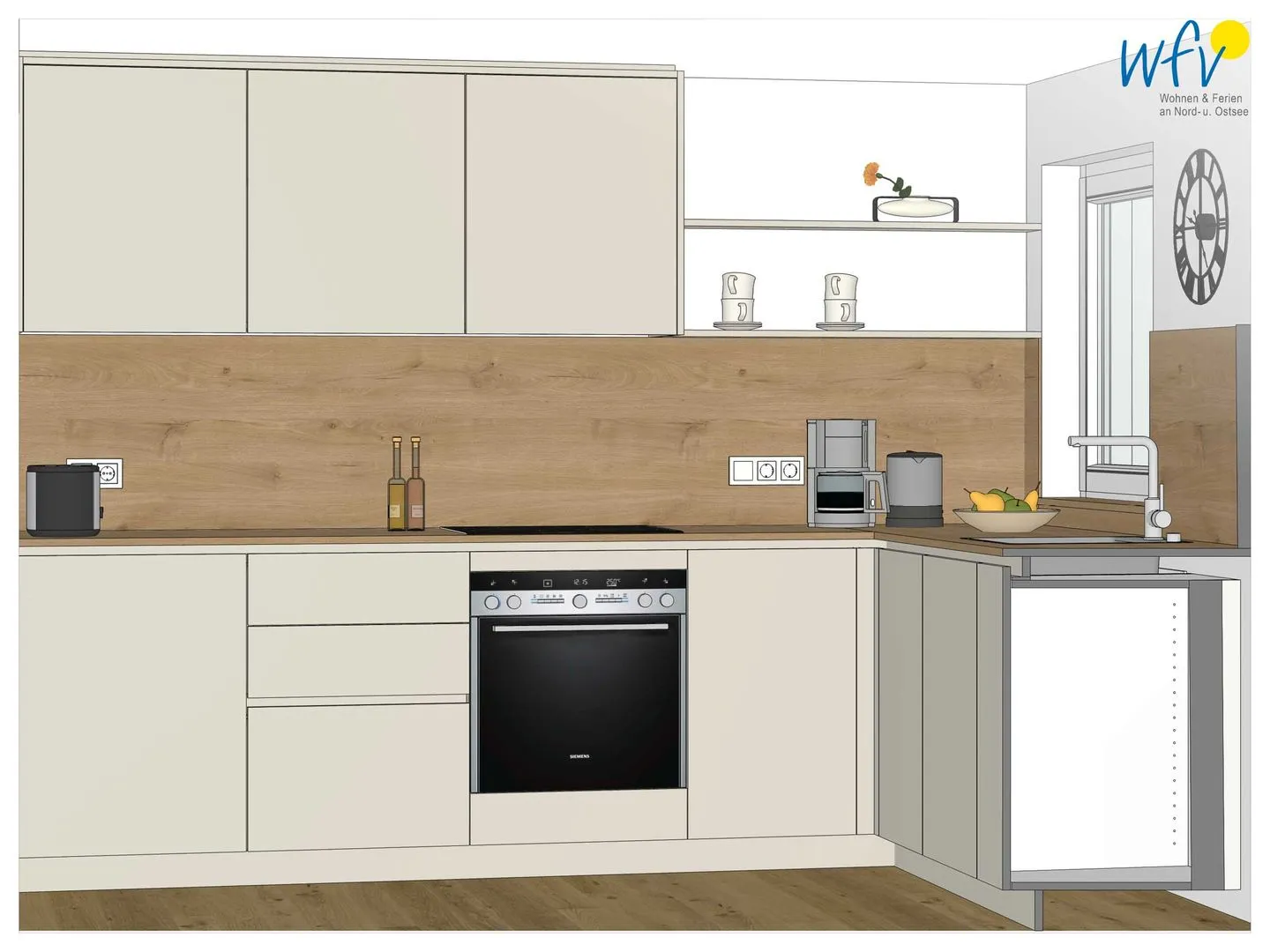 Großzügige 66 m² Wohnfläche und bodentiefe Fenster bieten Ihnen ein weites Raumgefühl. Der helle Wohnbereich mit einem Ensemble aus bequemer Couchecke, modernem SmartTV und rundem Esstisch lädt nach dem Strandspaziergang zur Entspannung ein. Vom Wohnzimmer aus gelangen Sie direkt auf die Terrasse / Garten. Ideal zum Ausspannen, Lesen oder um den Tag bei einem Glas Wein ausklingen zu lassen.