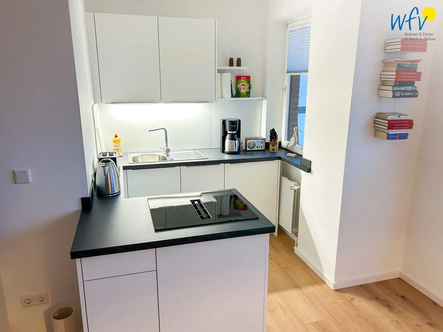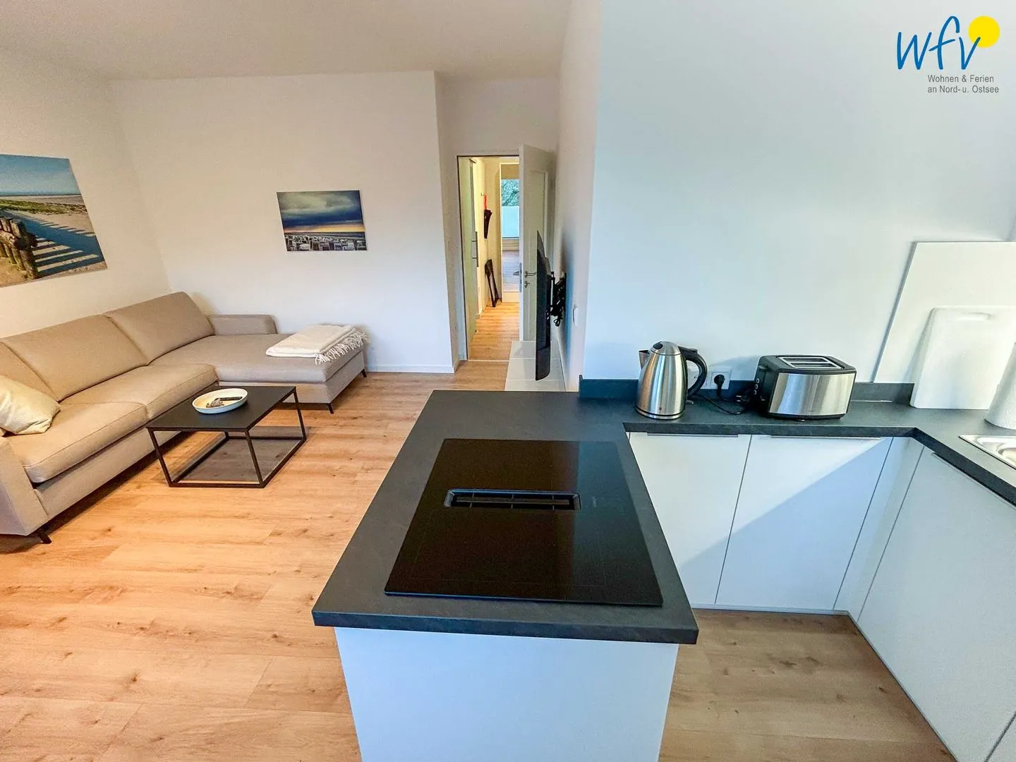 In der modernen offenen Küche lassen sich bequem kleine Snacks für den Ausflug oder leckere Mahlzeiten zubereiten. Ausgestattet ist die Küche u.a. mit einem 4-Zonen-Induktionskochfeld mit integriertem Dunstabzug, einem Geschirrspüler und einem Kühlschrank sowie mit diversen Kleingeräten (Kaffeemaschine, Wasserkocher, Toaster etc.).