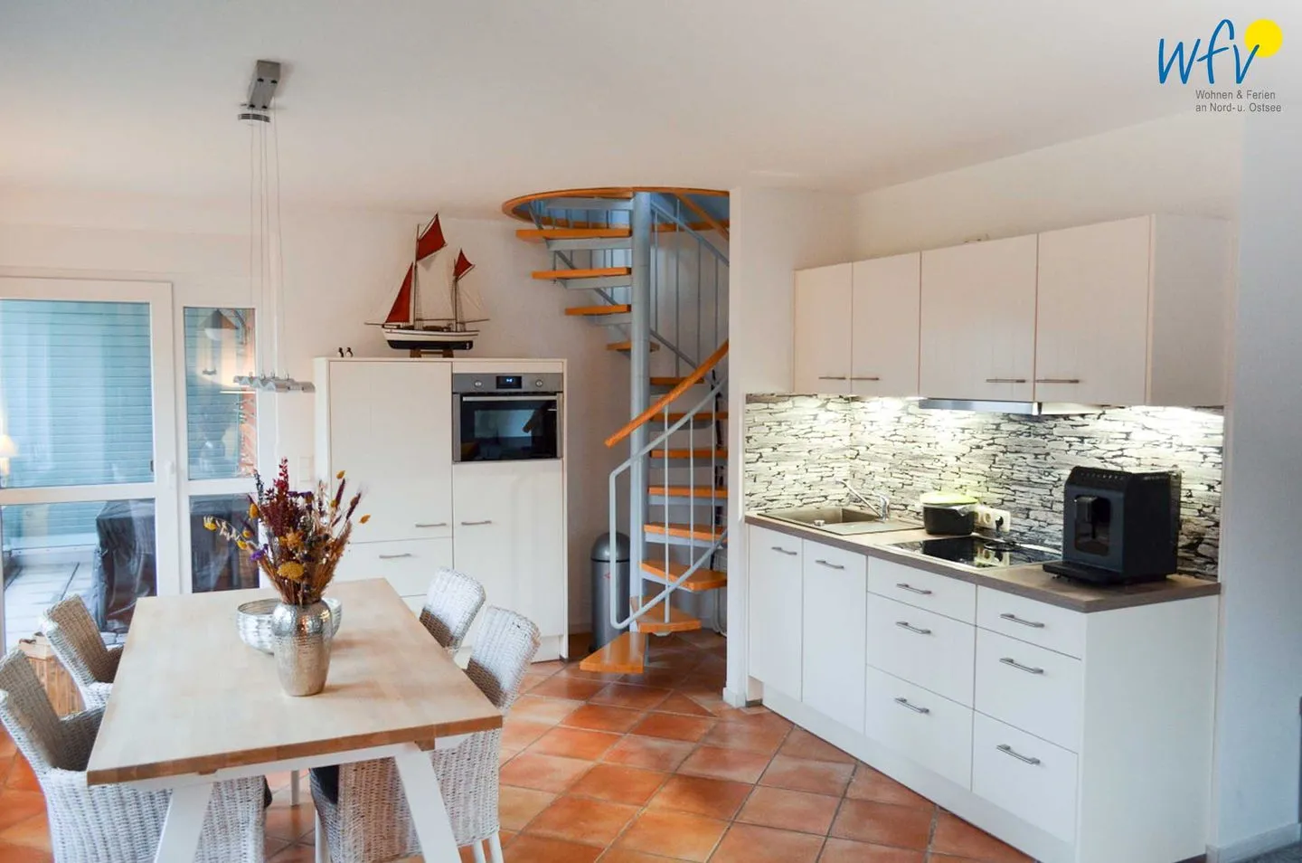 In der modernen offenen Küche lassen sich bequem kleine Snacks für den Ausflug oder leckere Mahlzeiten zubereiten. Ausgestattet ist die Küche u.a. mit 4-Plattenherd, Backofen, Mikrowelle, Geschirrspüler und Kühlschrank mit Gefrierfach sowie mit diversen Kleingeräten (Wasserkocher, Toaster, Mixer etc.). Als Kaffeeliebhaber genießen Sie den Komfort eines Kaffeevollautomaten mit Bohnen. Ein Esstisch lädt zu gemeinsamen Mahlzeiten ein. Zum Ausspannen steht eine gemütliche Couchecke mit TV, Radio und HiFi-Anlage bereit; WLAN und Internet sind ebenfalls vorhanden.