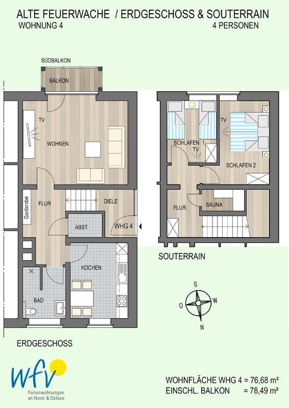 Auf knapp 80 m² über zwei Etagen haben Sie jede Menge Platz für bis zu 4 Personen. Also ideal, für Ferien mit der Familie oder mit Freunden.