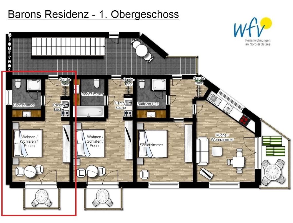 Das Apartment befindet sich im 1. Obergeschoss der "Barons Residenz", verfügt über eine Wohnfläche von 25 m² und besteht aus einem Wohn-/Schlafraum, einem Bad mit Dusche und einem Vorraum mit Pantryküche...