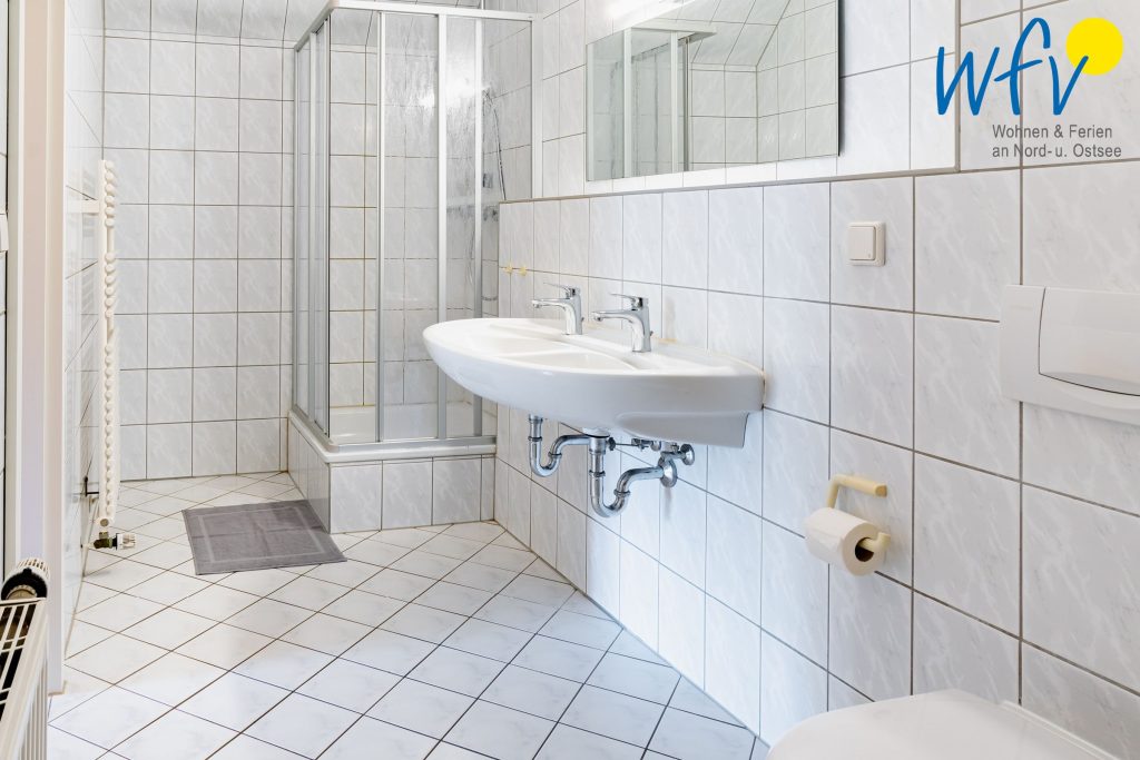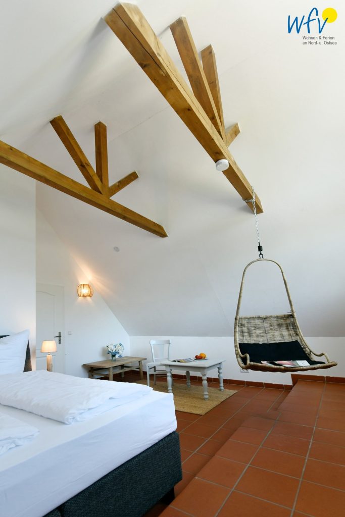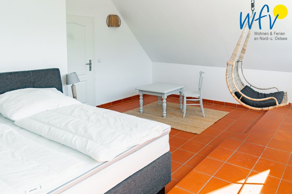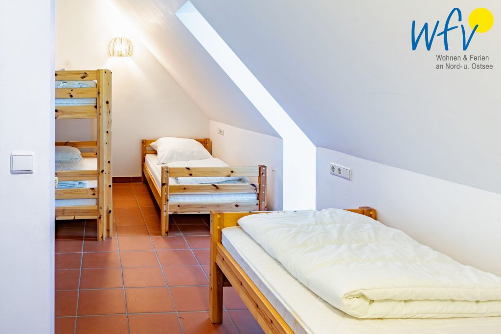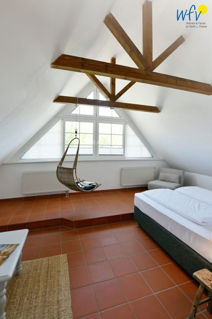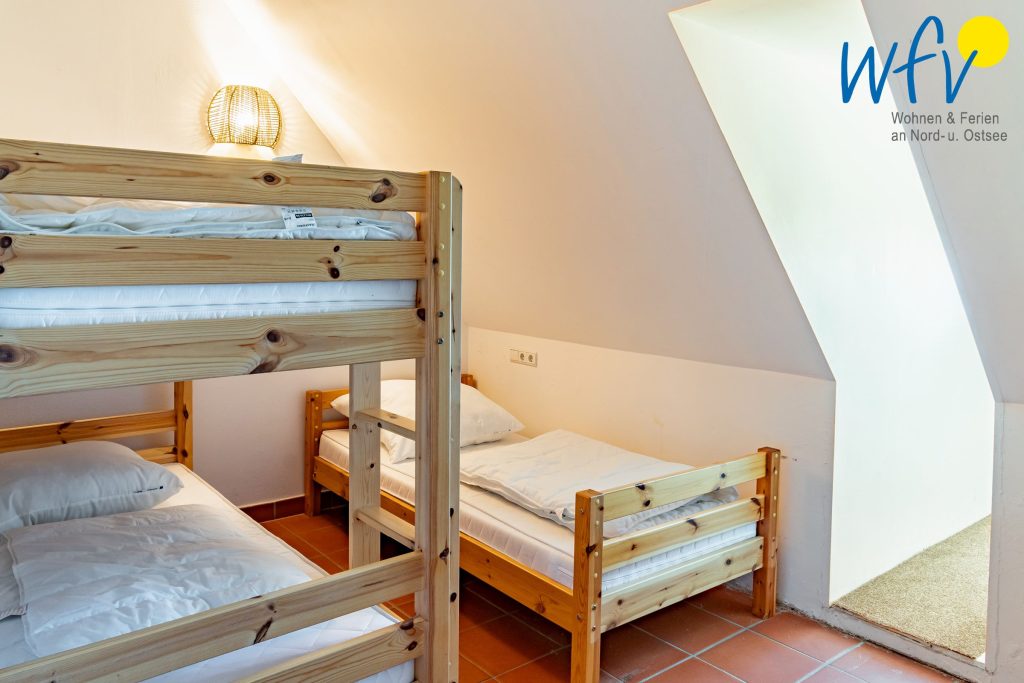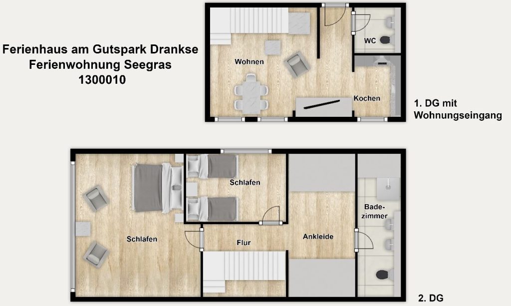 Die Ferienanlage umfasst 23 Ferienwohnungen. In unserem 75 m² großen Appartement "Seegras" über zwei Etagen erwartet Sie ein Wohnraum mit Sitzgelegenheiten, TV, Essbereich und Kochnische sowie zwei separate Schlafzimmer und ein Duschbad mit zusätzlichem Gäste-WC. Die Schlafzimmer sind mit einem Doppelbett (180 cm x 200 cm) bzw. zwei Einzelbetten (90 cm x 200 cm) und einem Etagenbett (90 cm x 200 cm) ausgestattet. Die Maisonettewohnung erstreckt sich über das 1. OG (Wohn- und Küchenbereich, Gäste-WC) und das 2. OG (Schlafbereiche + Bad).