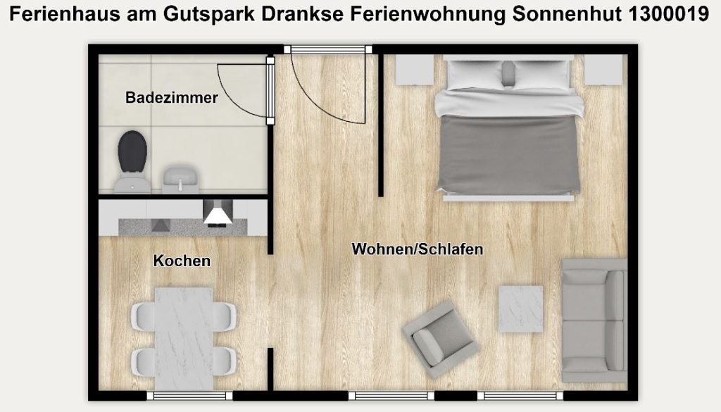 Die Ferienanlage umfasst 23 Ferienwohnungen. In unserem 31 m² großen Appartement "Sonnenhut" im 1. Obergeschoss erwartet Sie ein kombinierter Wohn-/Schlafraum mit bequemen Sitzgelegenheiten, Doppelbett (180 cm x 200 cm), Kochnische und Essplatz sowie ein Duschbad.