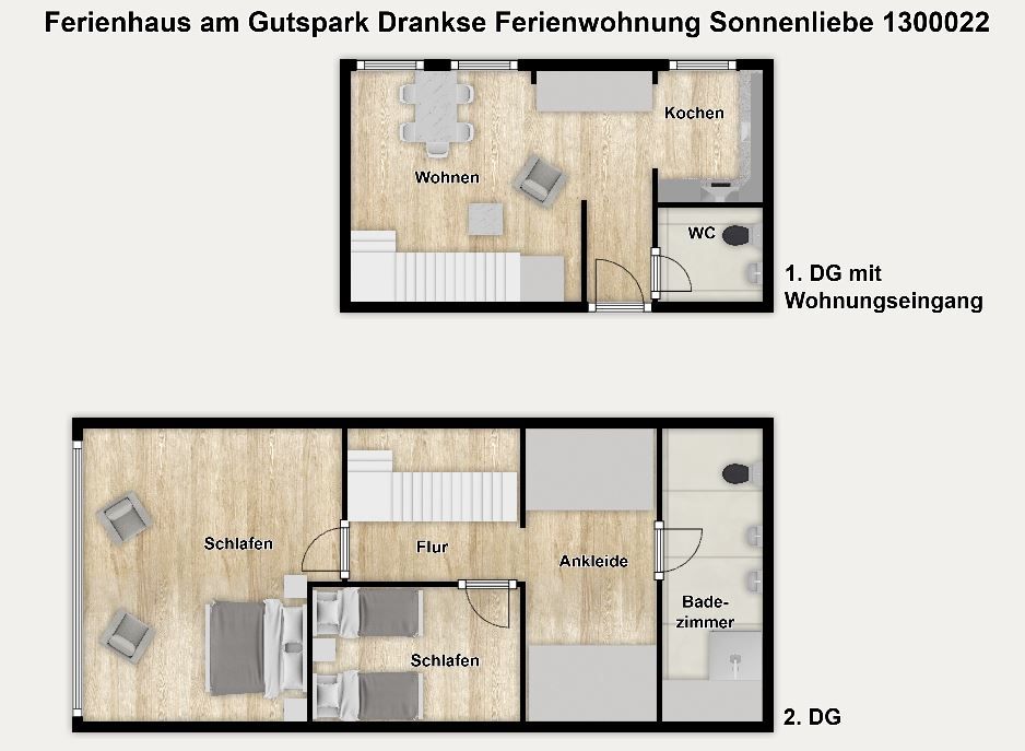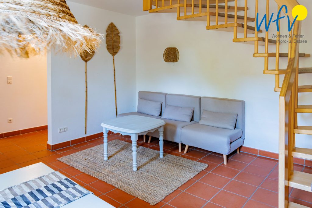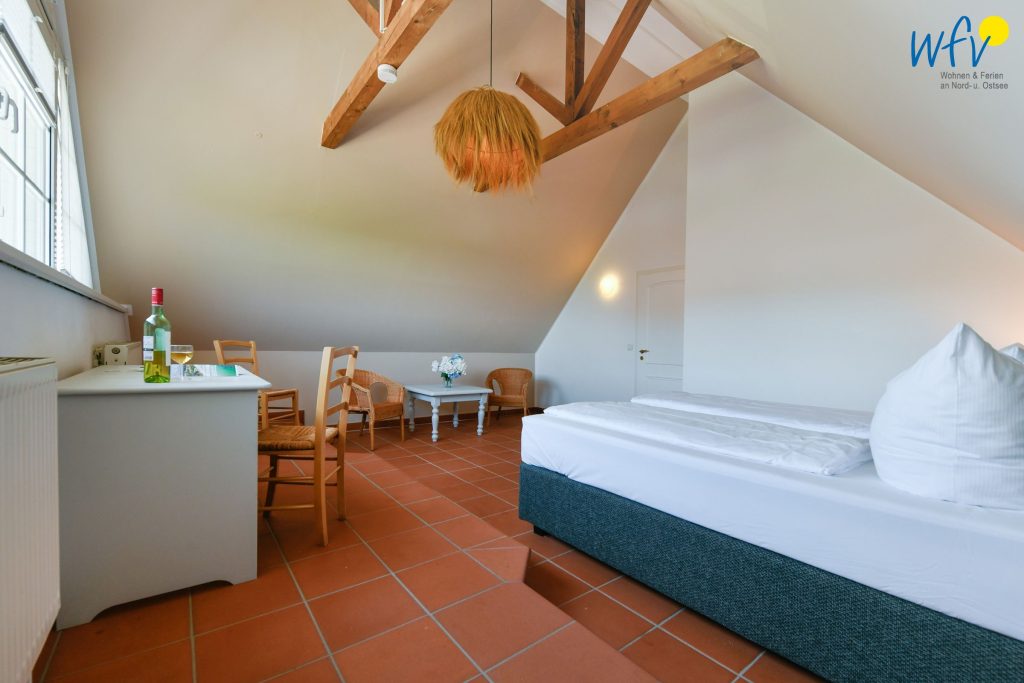 Die Ferienanlage umfasst 23 Ferienwohnungen. In unserem 75 m² großen Appartement "Sonnenliebe" über zwei Etagen erwartet Sie ein Wohnraum mit Sitzgelegenheiten, TV, Kochnische und Essplatz sowie zwei separate Schlafzimmer und ein Duschbad mit zusätzlichem Gäste-WC. Die Schlafzimmer sind mit einem Doppelbett (180 cm x 200 cm) bzw. einem Einzelbett (90 cm x 200 cm) und einem Etagenbett (90 cm x 200 cm) ausgestattet. Die Maisonettewohnung erstreckt sich über das 1. OG (Wohn- und Küchenbereich, Gäste-WC) und das 2. OG (Schlafbereiche + Bad).