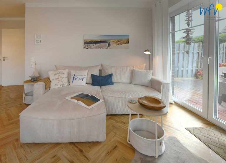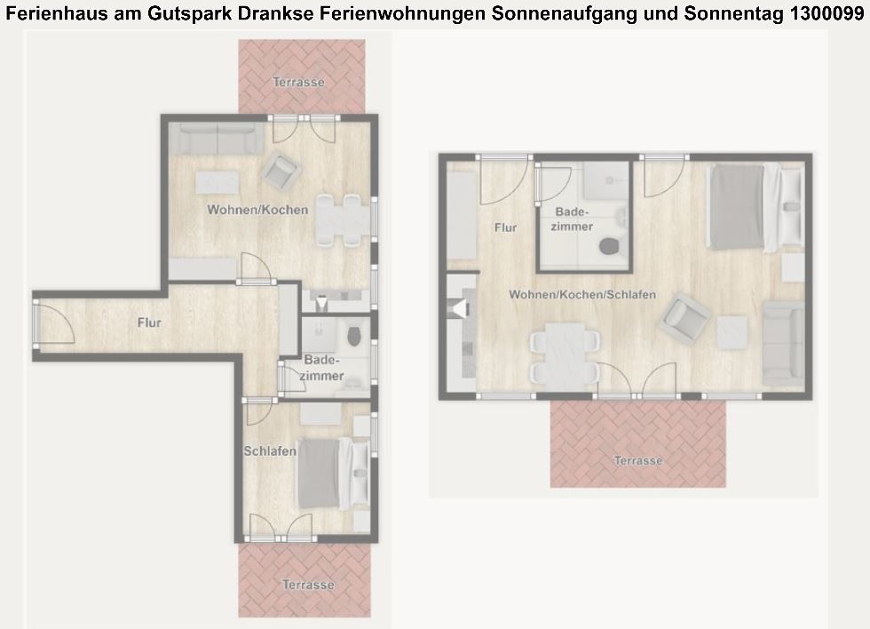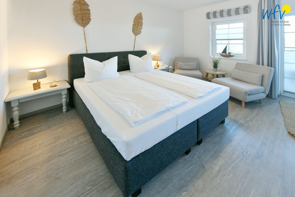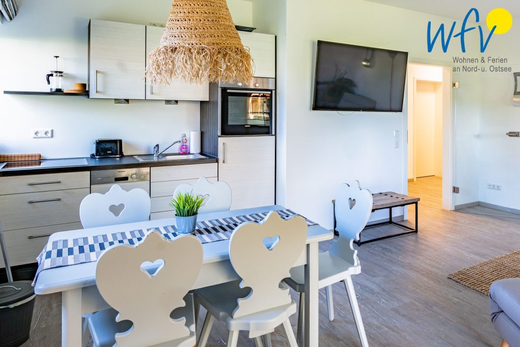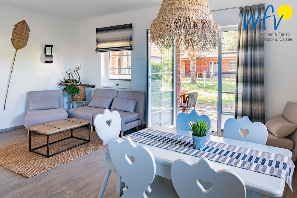 Die Ferienanlage umfasst 23 Ferienwohnungen. Bei dieser Ferienwohnung handelt es sich um die Zusammenlegung der zwei Appartements "Sonnenaufgang" und "Sonnentag" im Erdgeschoss. So erwartet Sie ein kombinierter Wohn-/Schlafraum mit Sitzgelegenheiten, Doppelbett (180 cm x 200 cm), offener Küche und Essplatz sowie ein Duschbad. Außerdem ein Wohnraum mit Schlafcouch, TV, offener Küche und Essplatz sowie ein separates Schlafzimmer mit Doppelbett (180 cm x 200 cm) und ein Duschbad. Auf zwei Terrassen können Sie die wohltuende Ostseeluft genießen.