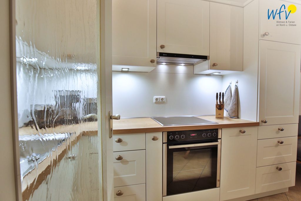 Das Ferienfrühstück, Snacks für den Ausflug oder das leckere Abendessen können Sie schnell und einfach in der modernen Küche zubereiten. Sie verfügt u.a. über einen Ceranherd, einen Backofen und eine Spülmaschine sowie über diverse Kleingeräte wie Kaffeemaschine, Wasserkocher und Toaster. Die Schränke in der Küche sind beleuchtet und werden durch einen Sensor unter dem Schrank eingeschaltet.