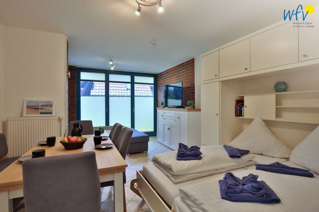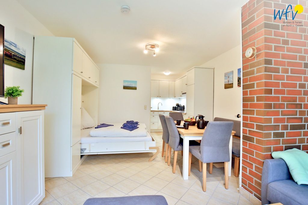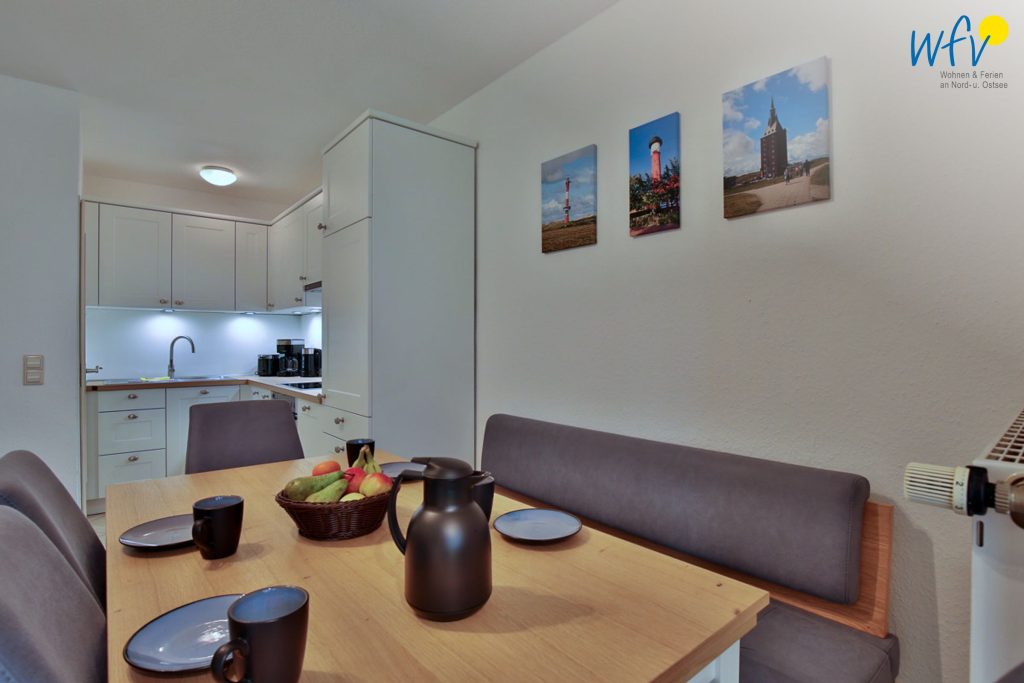 Der helle Wohnraum mit Essbereich sowie einer Couchecke mit modernem TV lädt zum Erholen und Wohlfühlen ein. Große Fenster verleihen dem Raum einen sehr schönen Lichteinfall. Maritime Inselfotos sorgen für das entsprechende Nordseegefühl.