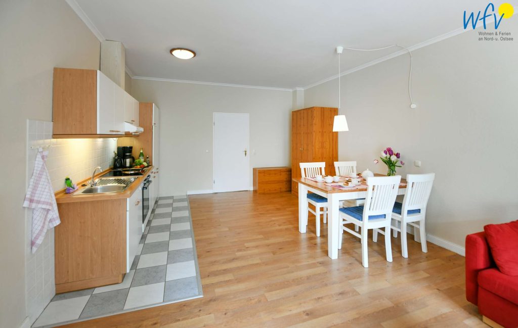 Ein großzügiger Wohnraum mit Couchecke, Essbereich und integrierter Küchenzeile sowie ein separates Schlafzimmer bieten Ihnen Platz für einen Urlaub zu zweit. Helle Räume, stilvolles Mobiliar und ein schöner Blick auf den Wald verleihen der Rügener Ferienwohnung viel Gemütlichkeit.