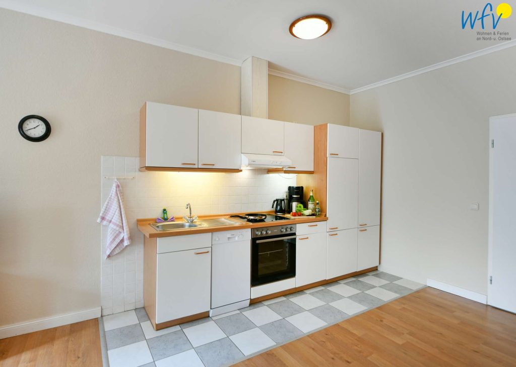 Damit Sie sich in Ihrem Urlaub auf Rügen bequem selbst verpflegen können, verfügt die Ferienwohnung über eine gut ausgestattete Küchenzeile u.a. mit Herd, Backofen, Kühlschrank mit Gefrierfach und Geschirrspüler sowie Kaffeemaschine, Wasserkocher und Toaster.