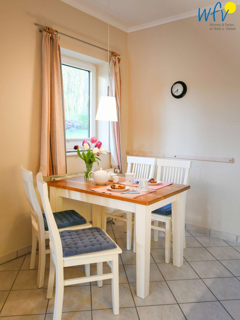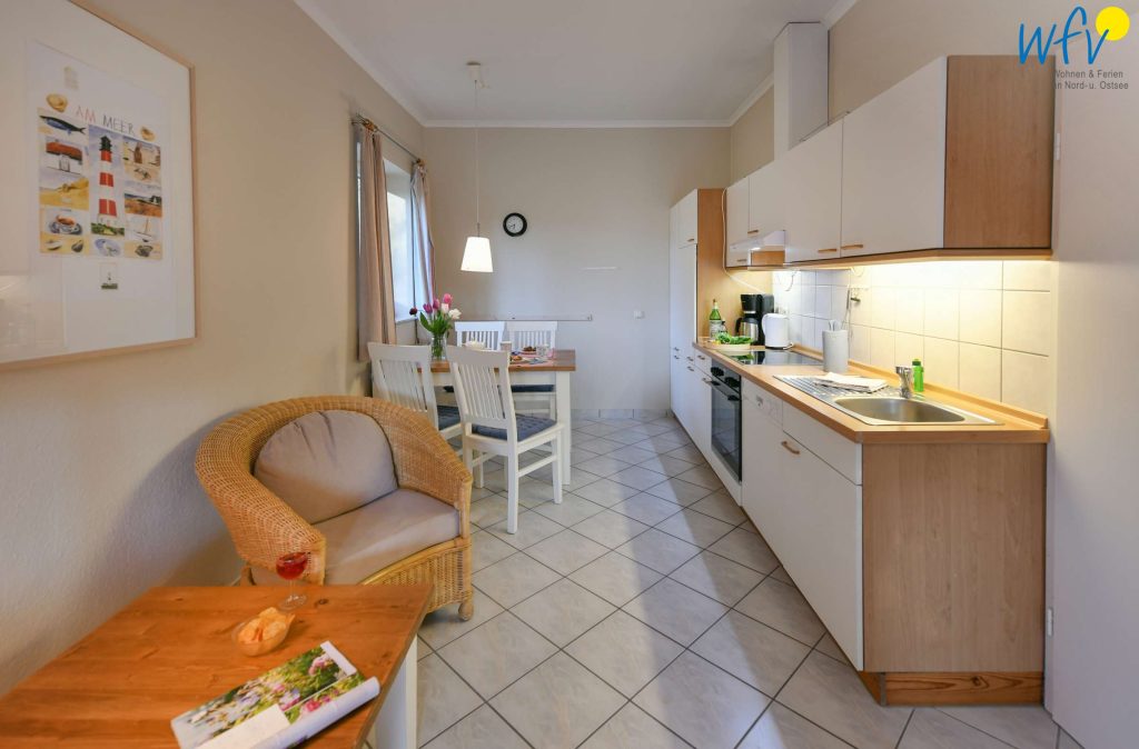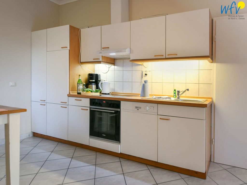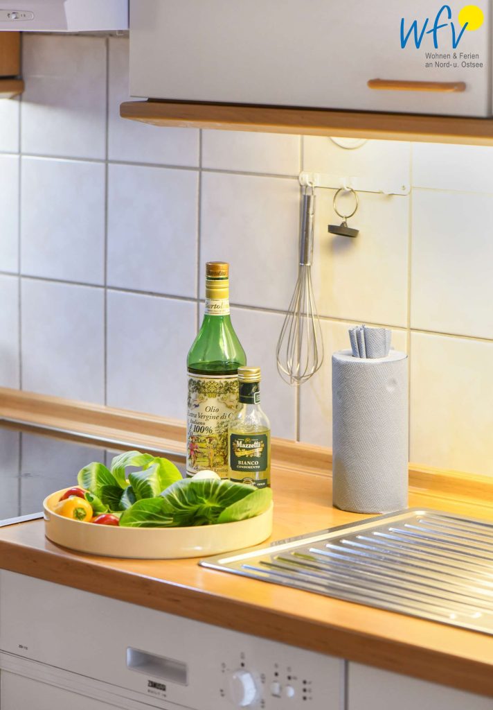 Damit Sie sich in Ihrem Urlaub auf Rügen bequem selbst verpflegen können, verfügt die Ferienwohnung über eine gut ausgestattete Küchenzeile u.a. mit Herd, Backofen, Kühlschrank mit Gefrierfach, Mikrowelle und Geschirrspüler sowie Kaffeemaschine, Wasserkocher und Toaster.