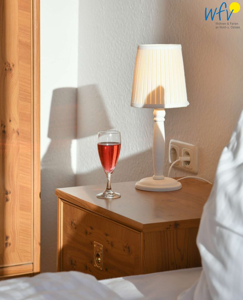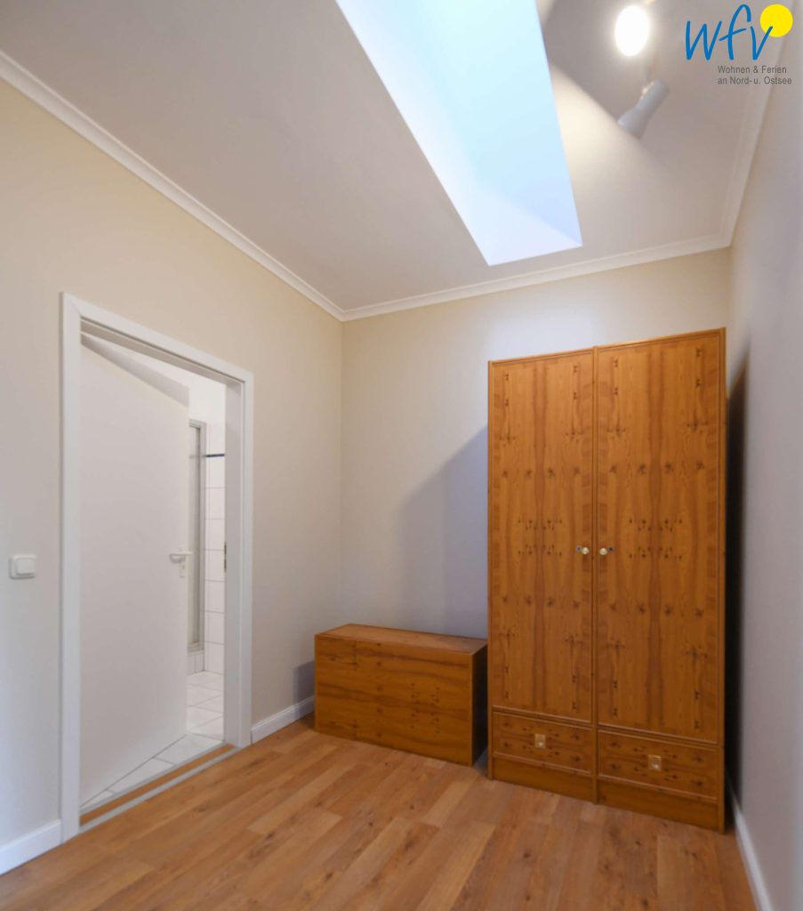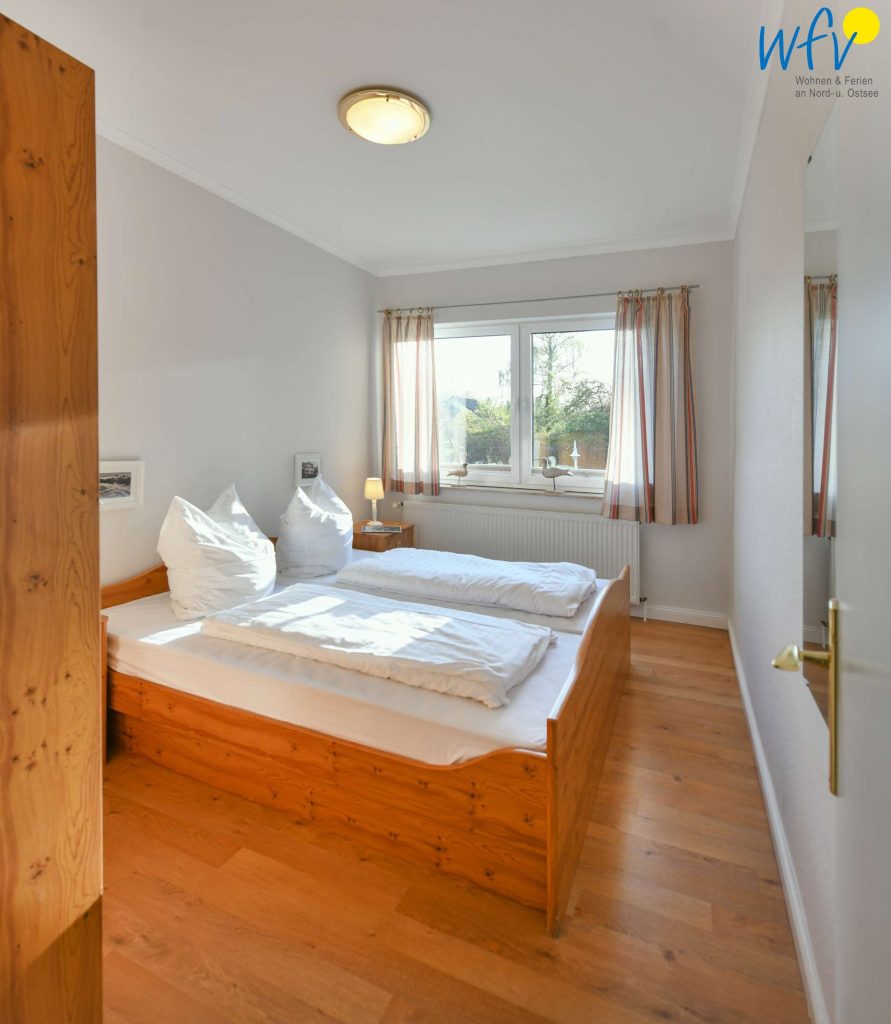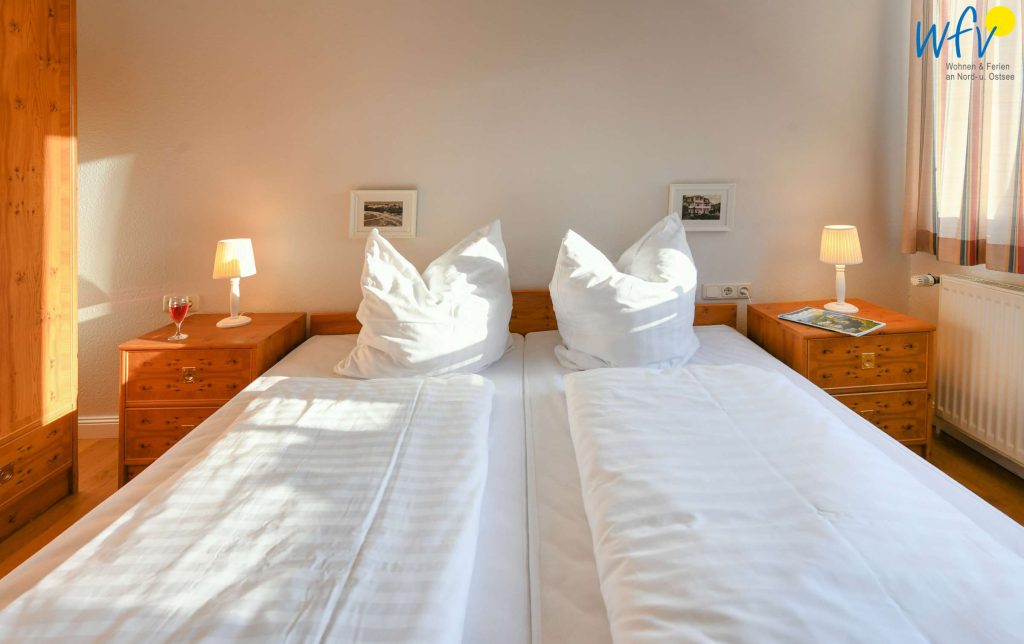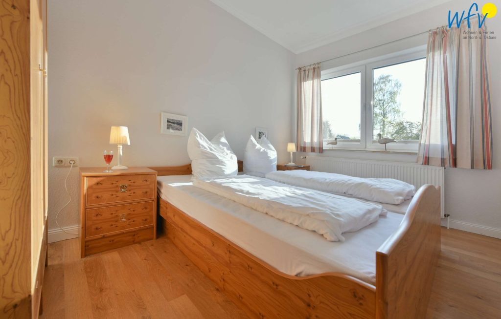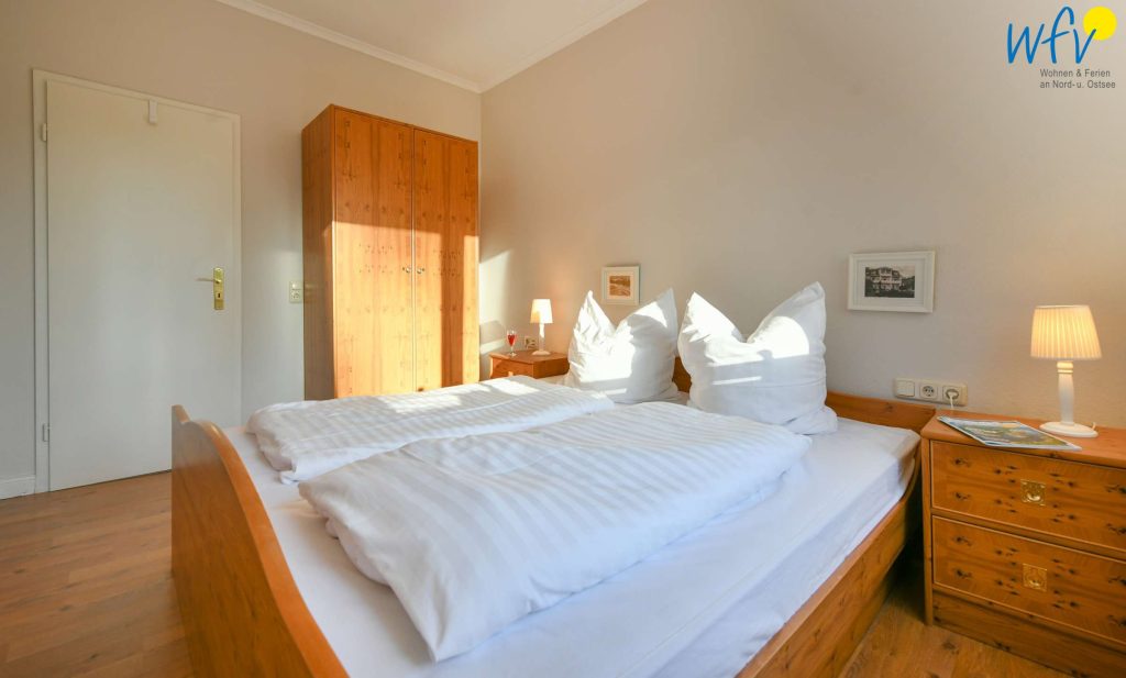 In dem separaten Schlafzimmer der Rügener Ferienwohnung befindet sich ein Doppelbett (1,80 m x 2 m) und ein Kleiderschrank. Eine Aufbettung ist möglich (auf Anfrage).