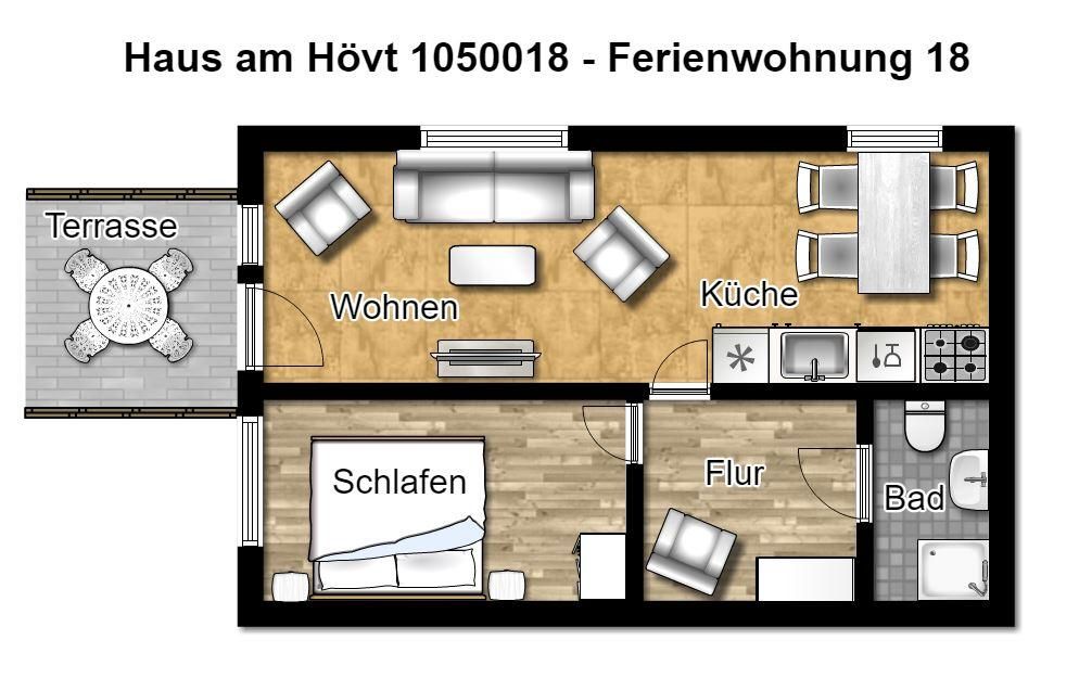 Wunderbar relaxen können Sie vor allem auf der möblierten Westterrasse! Zu der Ferienanlage „Haus am Hövt“ gehört zudem ein großer Gemeinschaftsgarten mit Grillplatz, Tischtennisplatte und Spielmöglichkeiten, den Sie gerne nutzen dürfen.