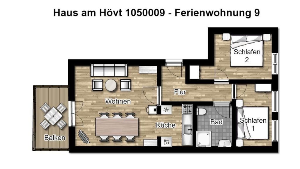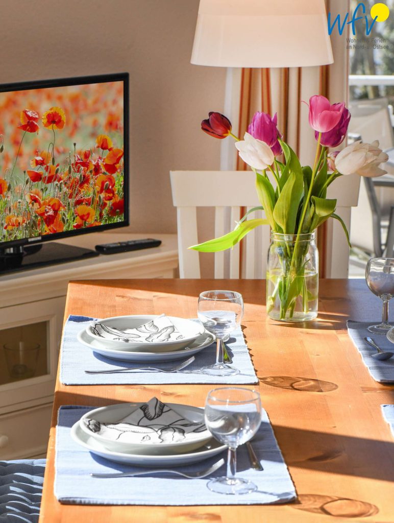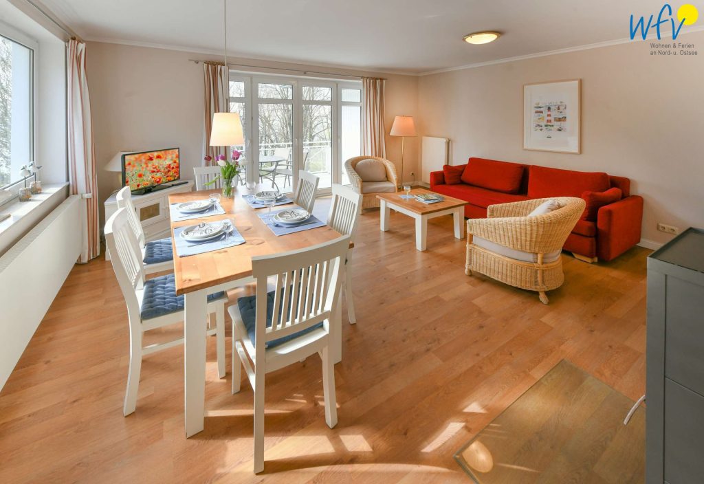 Unsere Ferienwohnung auf Rügen bietet jede Menge Platz für Ihren Familienurlaub! Auf 71 m² Wohnfläche erwarten Sie drei Zimmer – aufgeteilt in einen großzügigen Wohnraum mit Sitzecke, Esstisch und offener Küche und zwei separate Schlafzimmer mit Doppelbett.