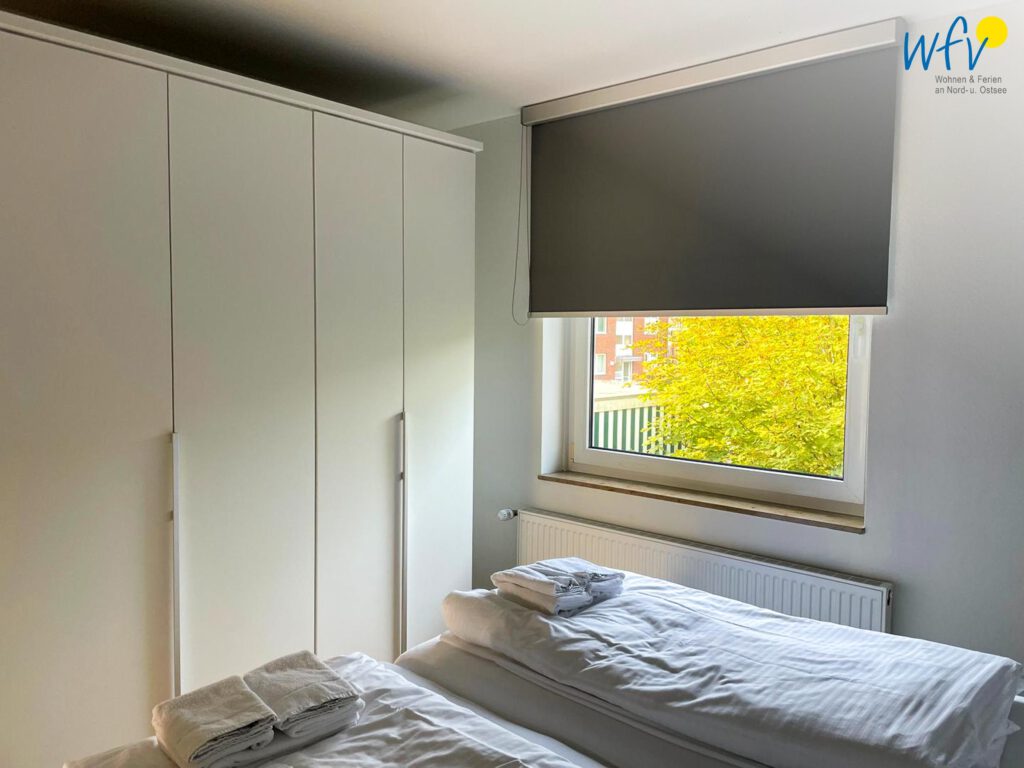 Das separate Schlafzimmer ist mit einem bequemen Doppelbett (180 x 200 cm) und einem geräumigen Kleiderschrank eingerichtet. Für zwei weitere Personen kann die Couch im Wohnraum zu einem Doppelbett umfunktioniert werden (180 x 200 cm).