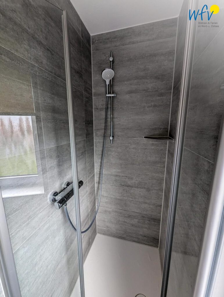 Das moderne Tageslichtbad mit bodengleicher Dusche, WC, Waschbecken mit Spiegel sowie Föhn und Kosmetikspiegel sorgt für weiteren Komfort.