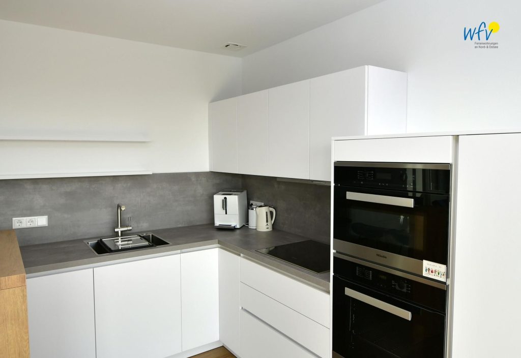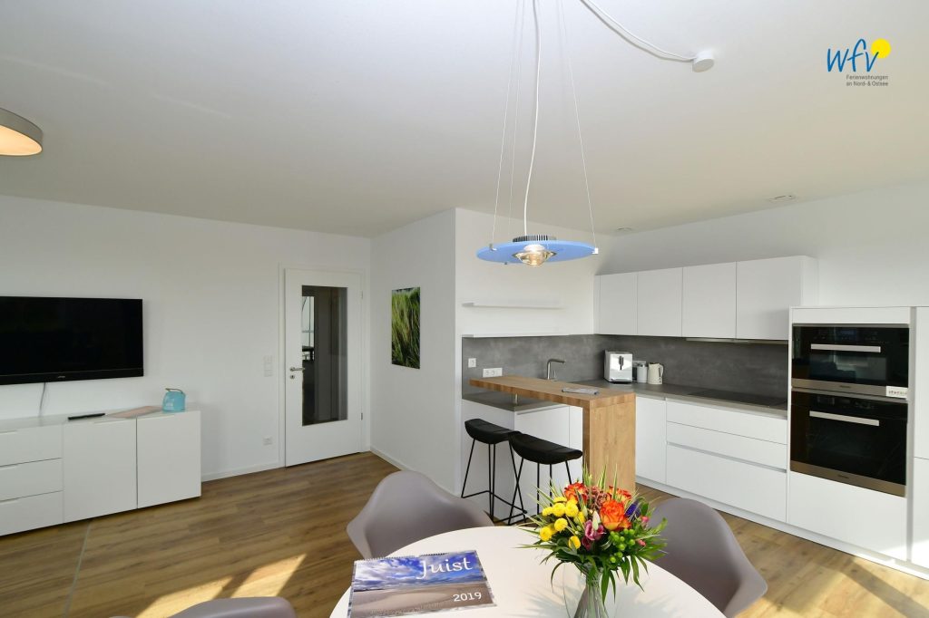 Für eine einfache Selbstverpflegung in Ihrem Urlaub auf Juist verfügt die moderne Küche u.a. über einen 4-Platten-Herd (Induktion), Backofen und Spülmaschine sowie über diverse Kleingeräte (Kaffeemaschine, Mixer, Wasserkocher etc.). Hier machen gemeinsame Kochabende richtig Spaß!