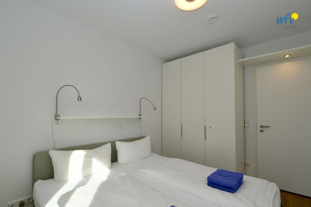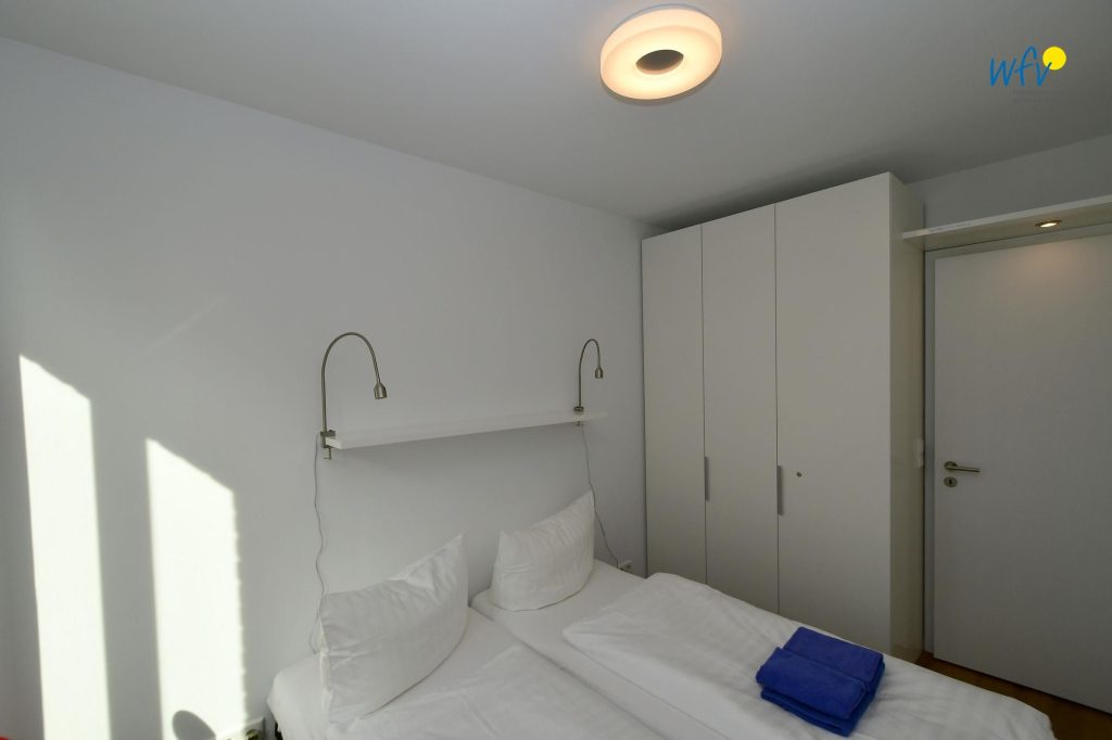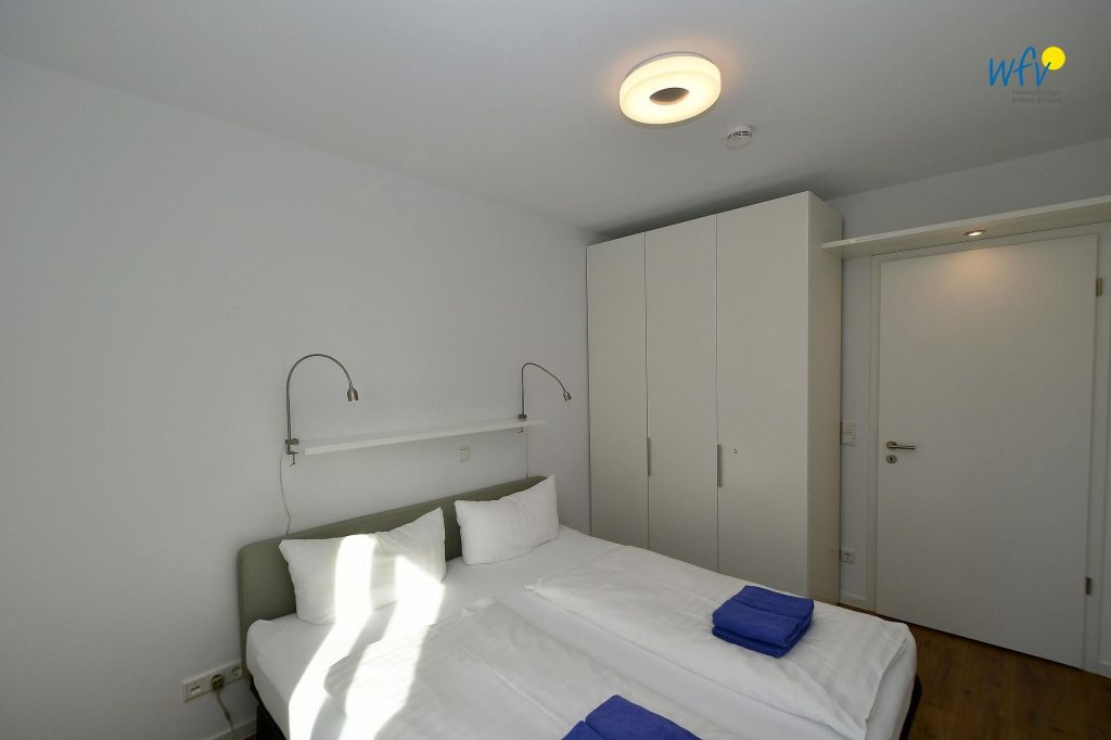 In einem der Schlafzimmer befindet sich ein Doppelbett, in dem anderen stehen zwei Einzelbetten (2x 90 x 200 cm; 2x 80 x 190 cm). Um die Ferienwohnung auch für Allergiker attraktiv zu halten, ist die Bettwäsche mit Synthetik gefüllt und die Böden sind mit PVC bzw. Holzimitat verlegt.