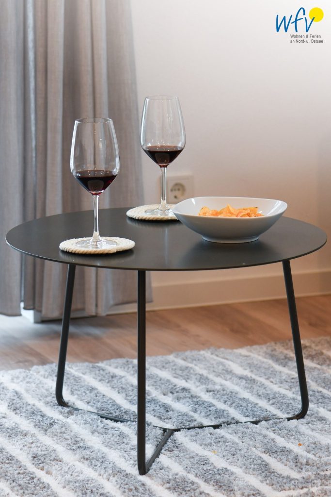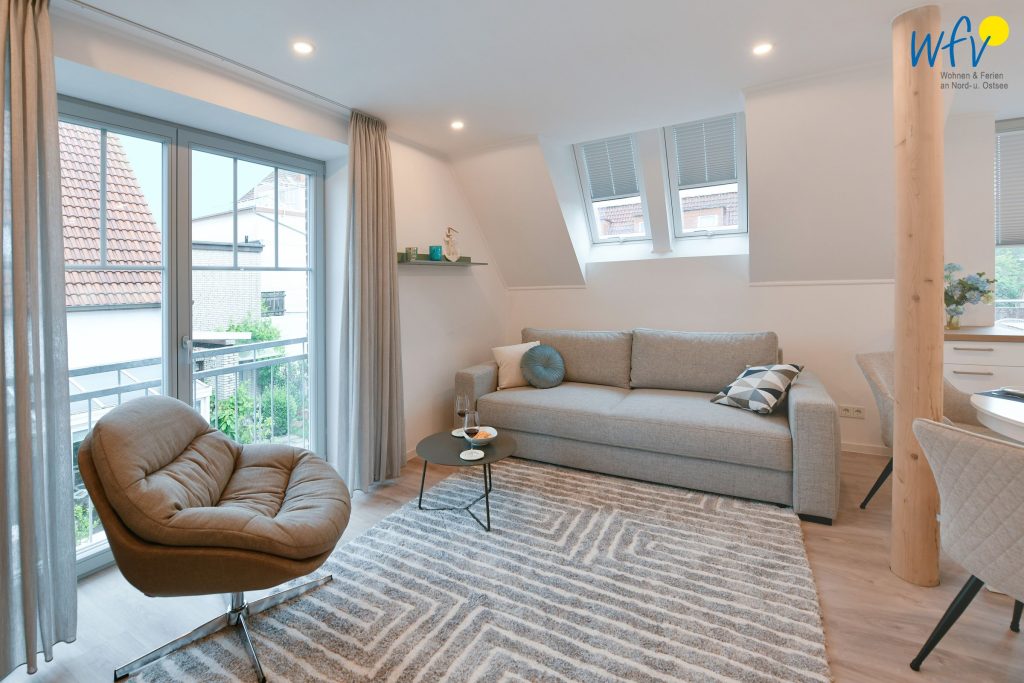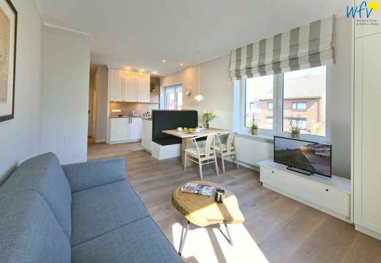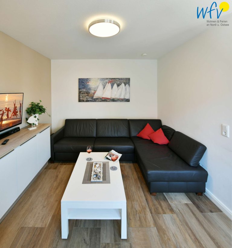 Nach dem Strandtag oder der Fahrradtour lädt der Wohnraum mit Couch, Relaxsessel und modernem TV zu entspannten Stunden ein.