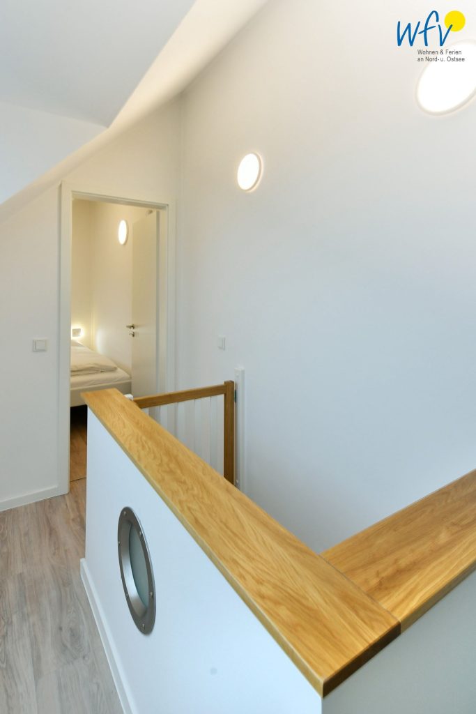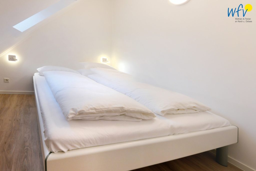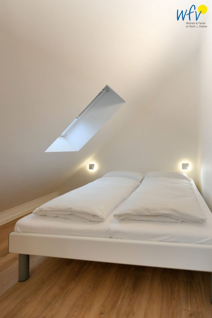 Angenehme Rückzugsmöglichkeiten bieten Ihnen zwei separate Schlafzimmer im Spitzboden. Sie sind mit einem komfortablen Doppelbett (160 cm x 200 cm) bzw. einem Einzelbett ausgestattet (90 x 200 cm; mit Auszug 80 cm x 190 cm). Für Ihre Urlaubsgarderobe befindet sich im Flur zwischen den Schlafzimmern ein geräumiger Kleiderschrank. Aufhängevorrichtungen mit Bügeln gibt es in den Einbauschränken unter der Treppe. Auf der bequemen Schlafcouch im Wohnzimmer können zwei weitere Personen schlafen.