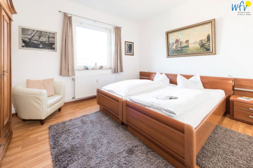 Wenn auf Wangerooge die Sterne zu sehen sind, wartet auf Sie ein gemütliches separates Schlafzimmer mit komfortablem Doppelbett. Weitere Schlafmöglichkeiten bietet Ihnen die ausziehbare Couch im Wohnraum.