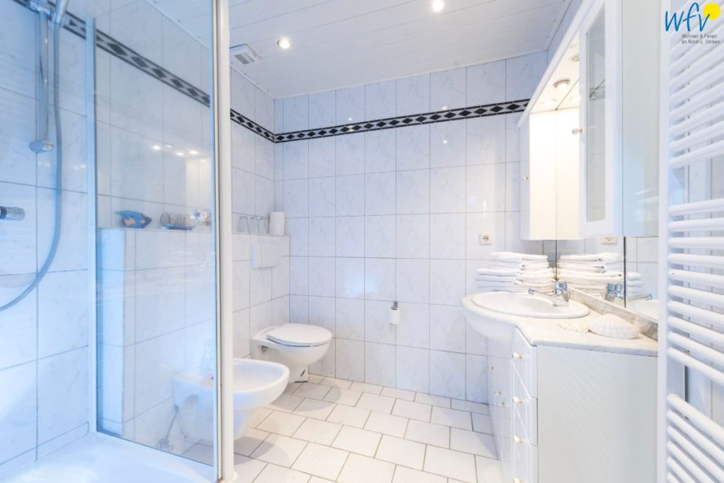 Weiterer Wohnkomfort besteht durch das große Duschbad mit hübschem Fliesenspiegel, breitem Spiegelschrank, Bidet und Handtuchheizung.