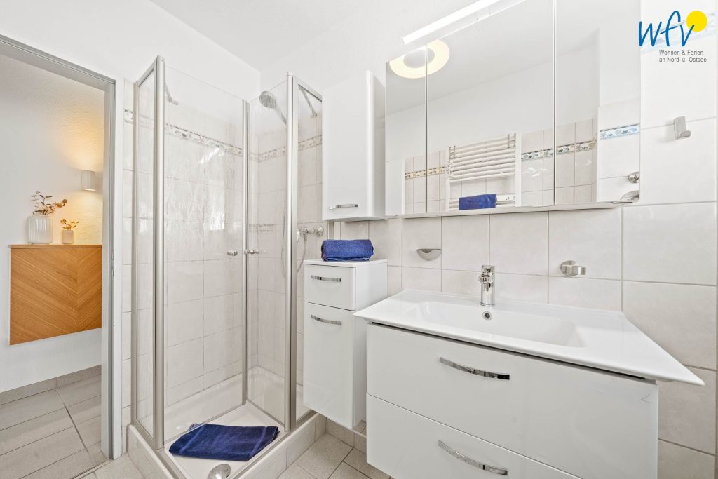 Weiteren Wohnkomfort und einen Ort für Entspannungszeit bietet Ihnen das moderne Tageslichtbad mit Dusche, Waschtisch, Spiegelschrank, Föhn und Handtuchheizung.