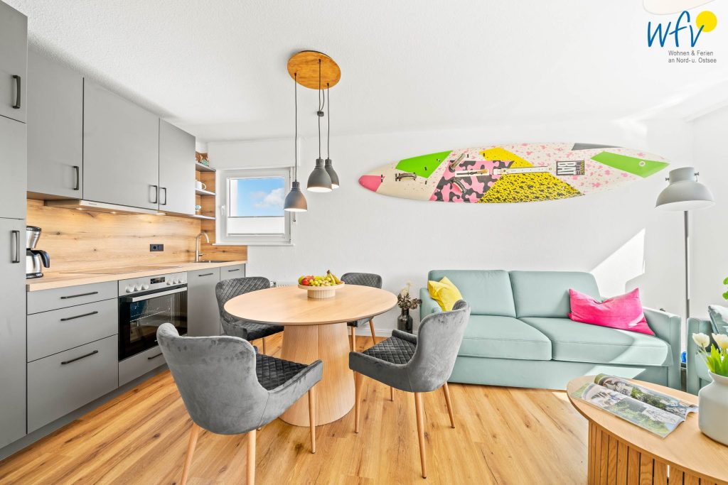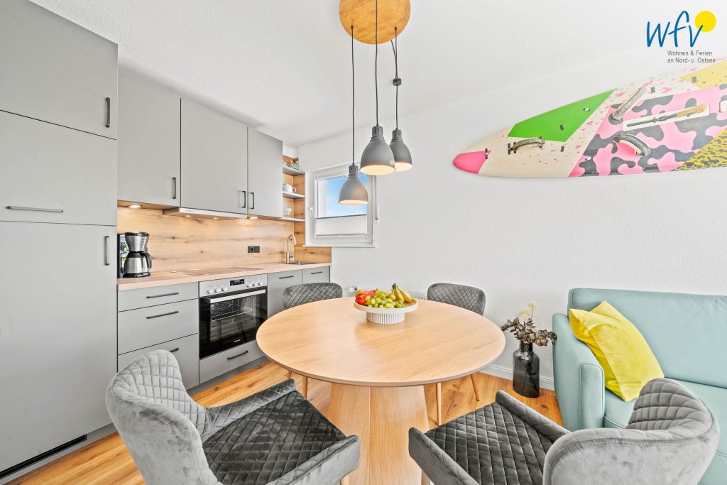Beim ausgiebigen Ferienfrühstück können Sie ganz in Ruhe in den Tag starten. Mit warmen Frühstücksbrötchen lassen sich am runden Esstisch wunderbar Pläne für den Urlaubtag schmieden und dann geht`s auf zum Strand oder mit dem Fahrrad quer über die Insel! Snacks für den Ausflug bereiten Sie bequem in der modernen offenen Küchenzeile mit Ceranherd, Backofen und Mikrowelle zu. Ebenso wie später das leckere Abendessen. Den Abwasch übernimmt für Sie die Spülmaschine.