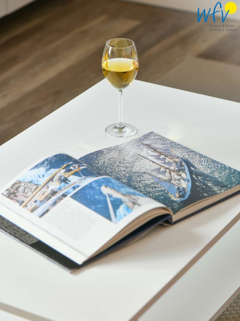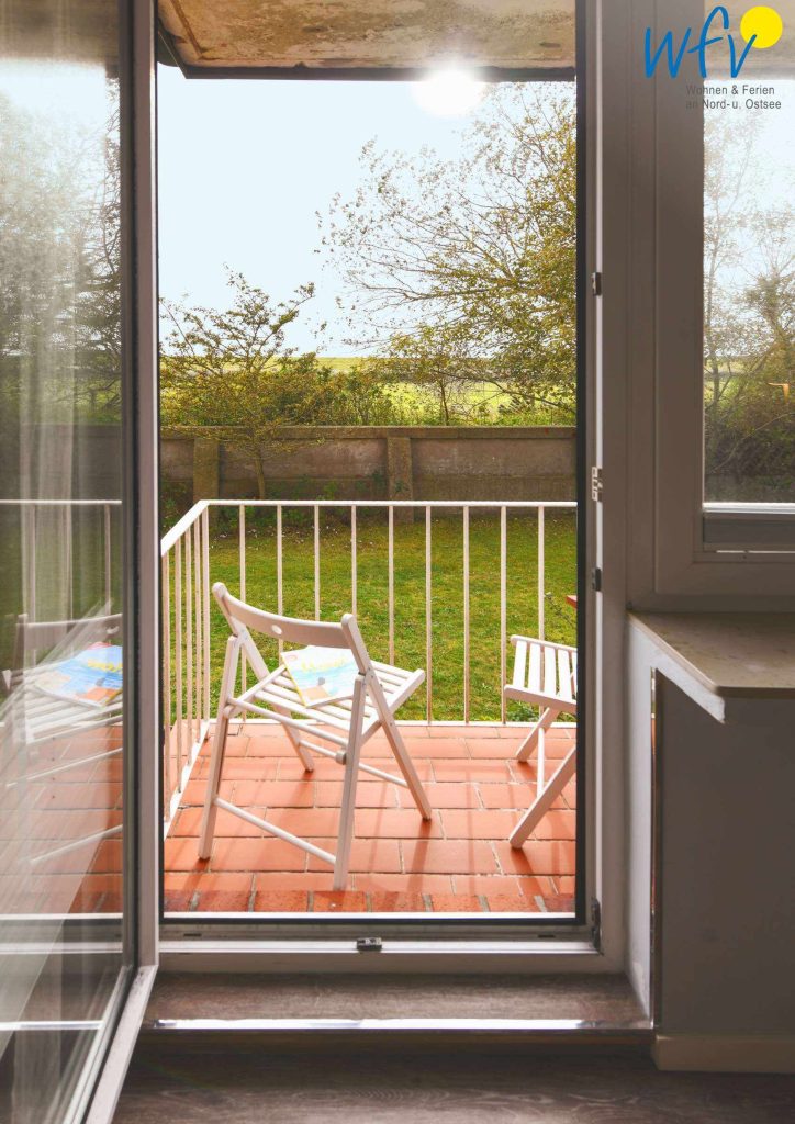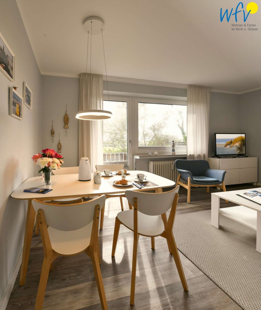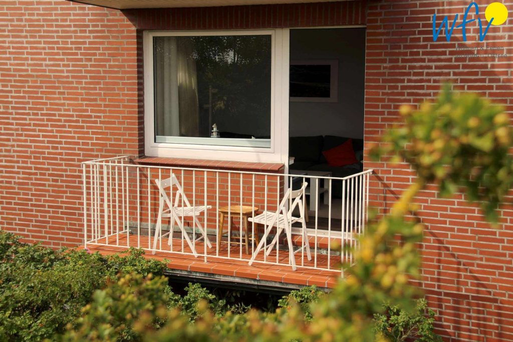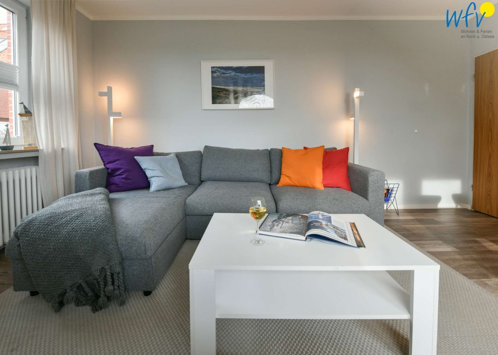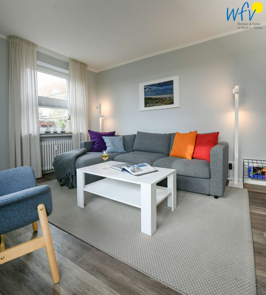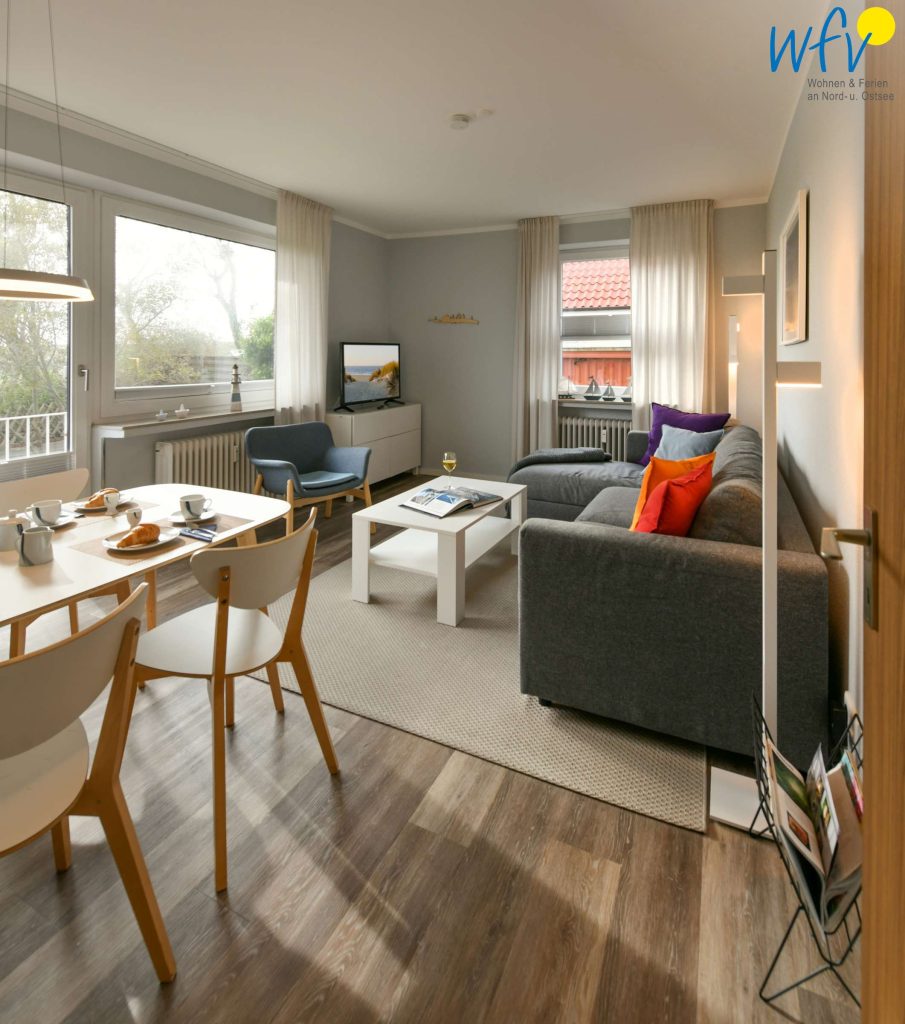 Der Wohnraum ist mit einer bequemen Sitzecke und Kabel-TV mit integriertem Radio ausgestattet. Vom Wohnzimmer aus gelangen Sie auf den schönen Balkon der Ferienwohnung. Hier lassen sich herrlich erholsame Stunden genießen - mit einer spannenden Urlaubslektüre und frischer Nordseeluft oder einem guten Glas Wein zum Tagesausklang!