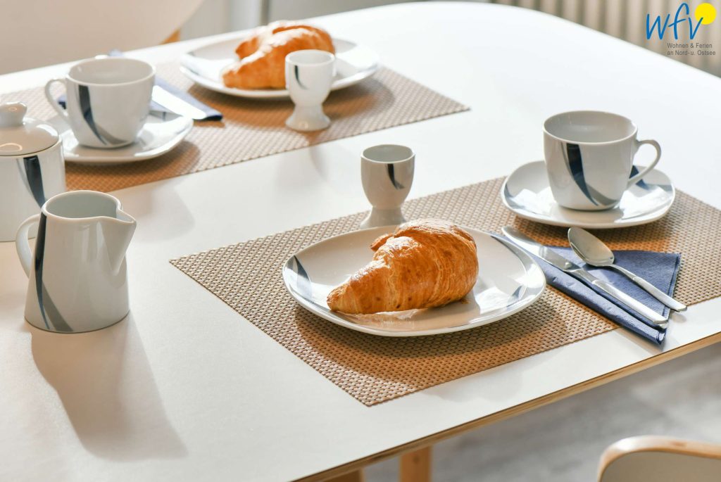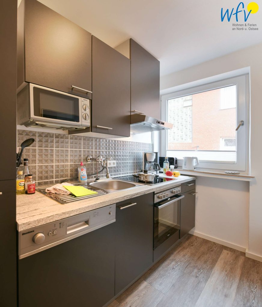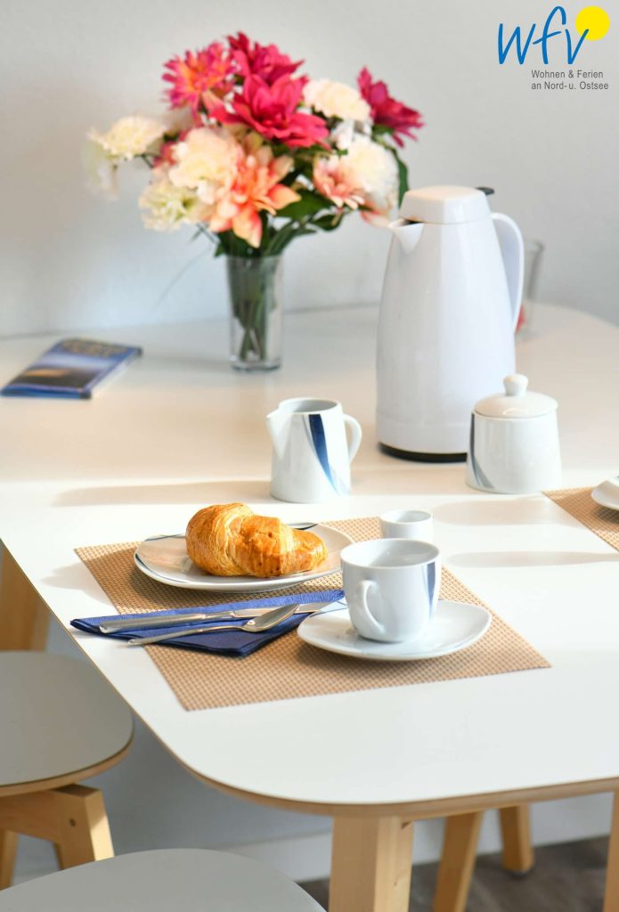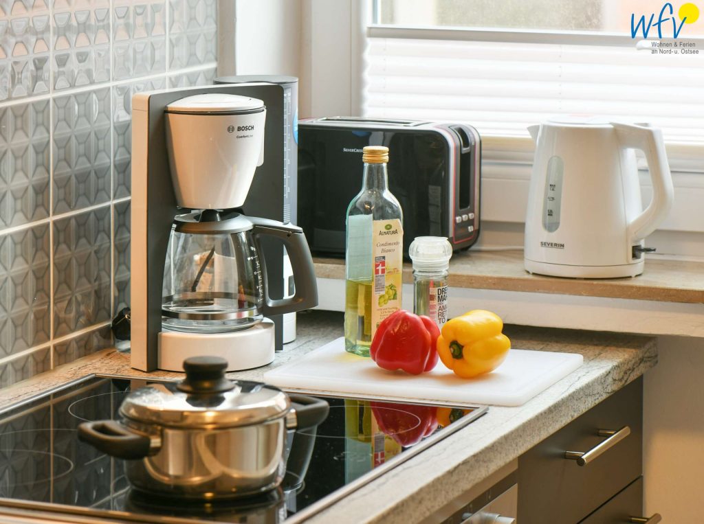 Die moderne Küchenzeile ist u.a. mit einem 4-Platten-Ceranherd, Backofen, Spülmaschine und Kühlschrank sowie diversen Kleingeräten (Mikrowelle, Kaffeemaschine, Toaster, Wasserkocher, Mixer etc.) ausgestattet. An dem gemütlichen Essplatz im Wohnzimmer lässt sich bereits beim Frühstück wunderbar der neue Urlaubstag planen.