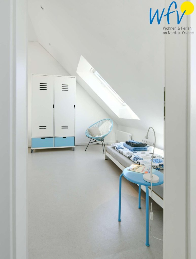 Das separate Elternschlafzimmer in der ersten Etage ist mit einem Doppelbett und einem begehbaren Kleiderschrank ausgestattet. In dem separaten Schlafraum im Dachgeschoss befinden sich vier Stapelbetten, die Sie auch ganz leicht zu Doppelbetten zusammenstellen können, sowie ein mobiler Kleiderschrank.