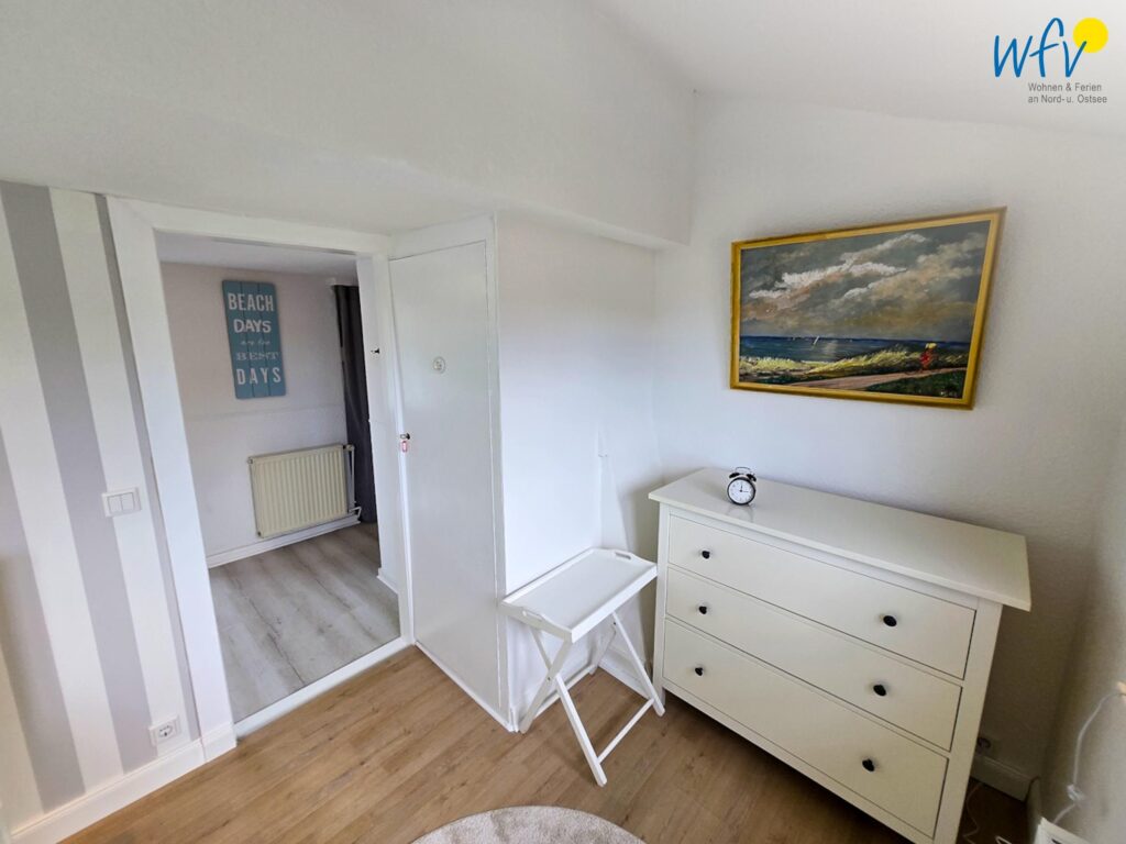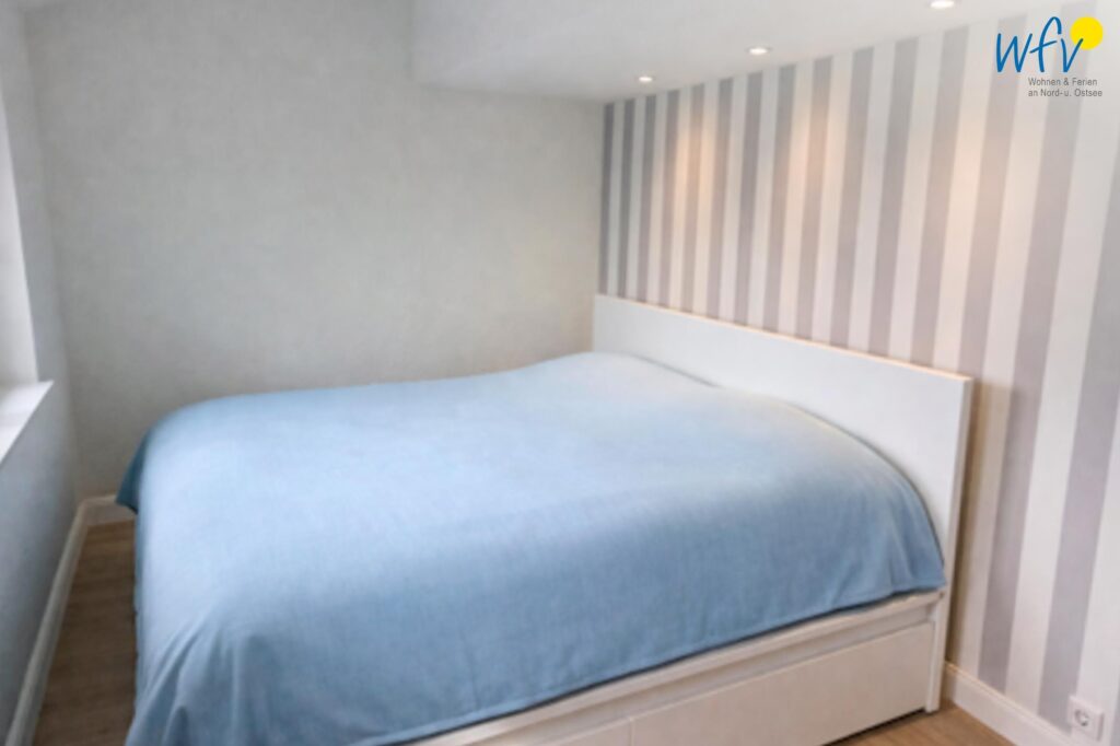 Das separate Schlafzimmer mit bequemem Doppelbett (180 x 200 cm) verspricht eine angenehme Nachtruhe. Ein Kleiderschrank bietet Ihnen Platz für die Urlaubsgarderobe. Im Flur befindet sich zudem eine funktionale Garderobe.