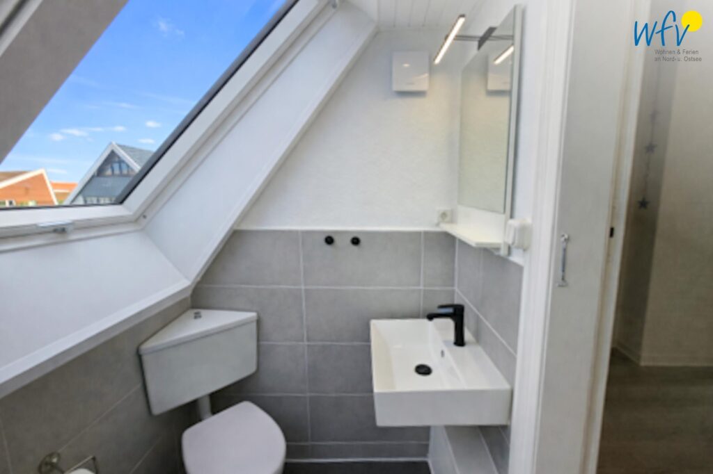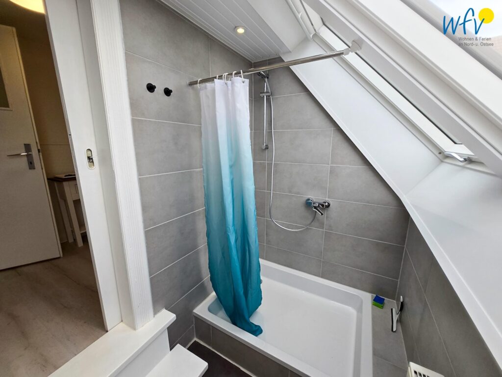 Nach einem Tag an der frischen Nordseeluft können Sie in dem kleinen gepflegten Tageslichtbad in Ruhe abschalten und eine erfrischende Dusche genießen. Es verfügt zudem über Waschbecken, WC, beleuchtetem Spiegel und Haartrockner.