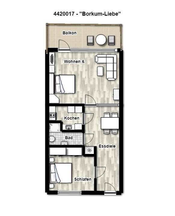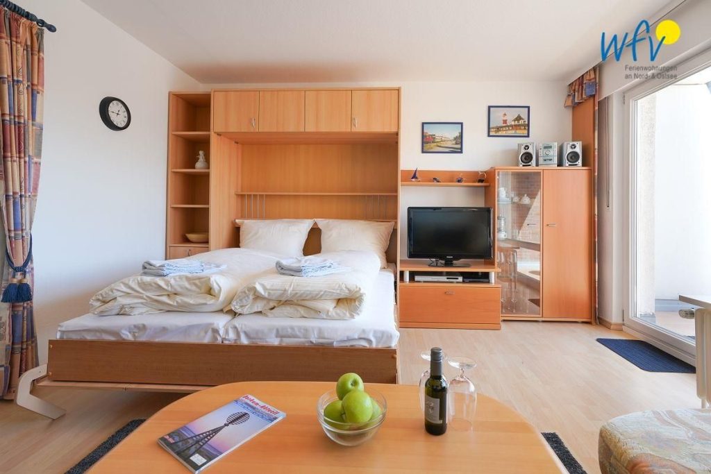 Die Ferienwohnung verfügt über einen Wohnraum mit integrierter Küchenzeile und Essbereich, ein separates Schlafzimmer, ein Bad und einen sonnigen und großzügigen Südbalkon.