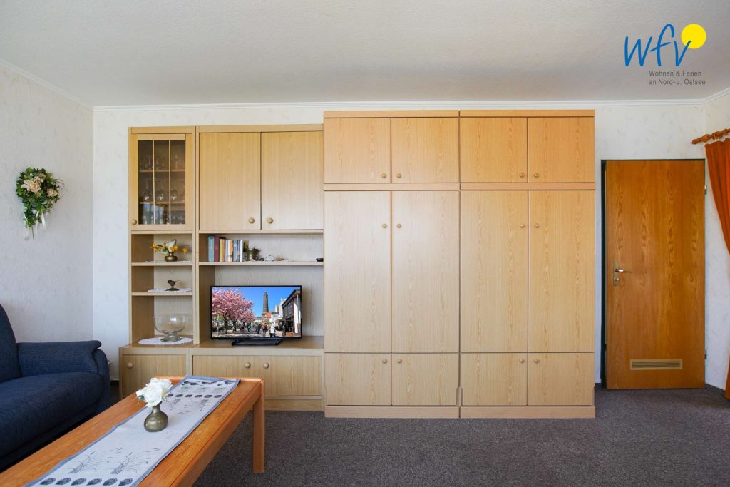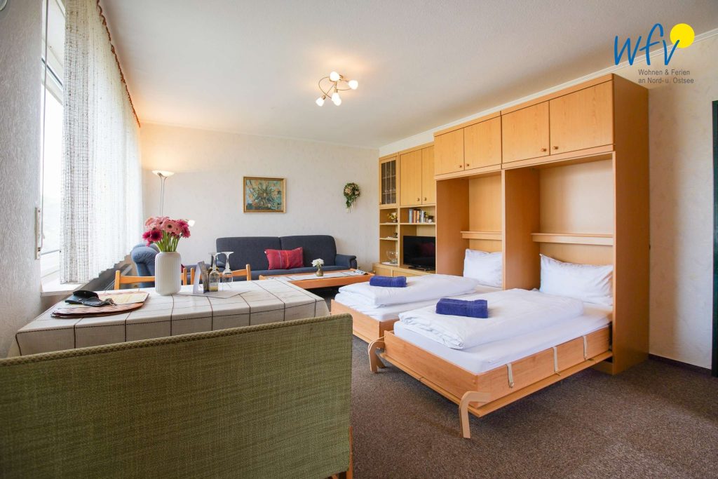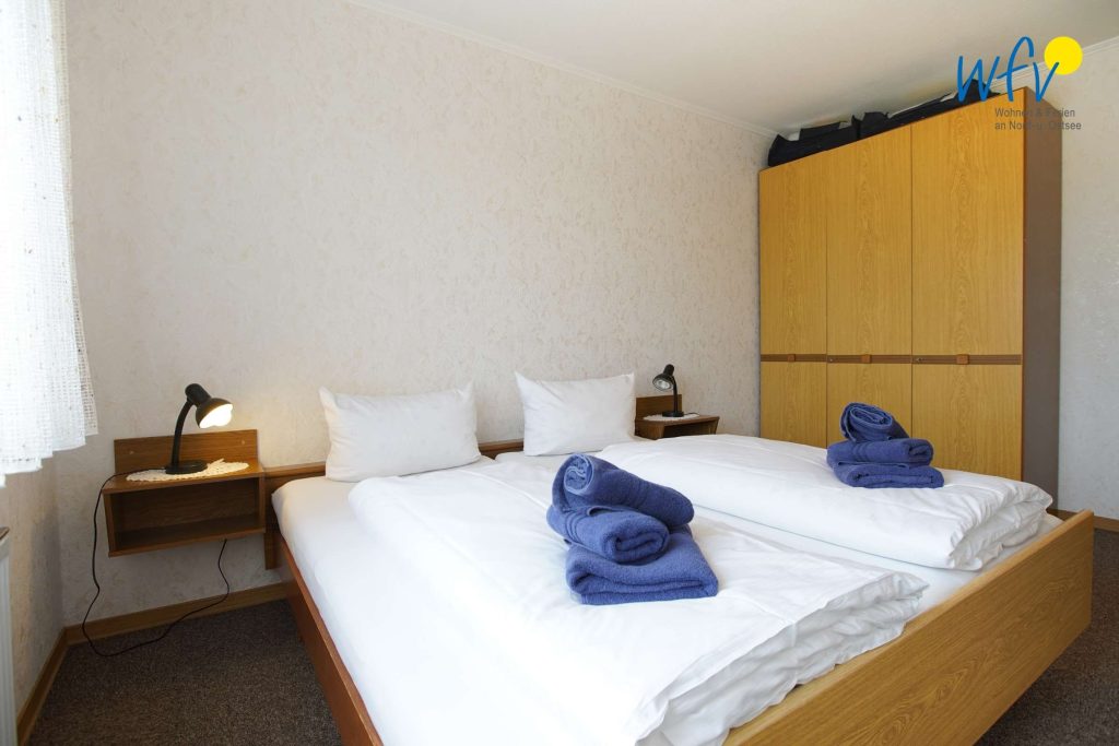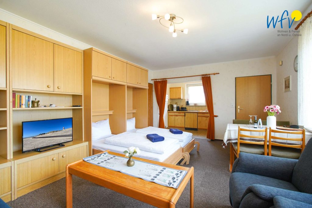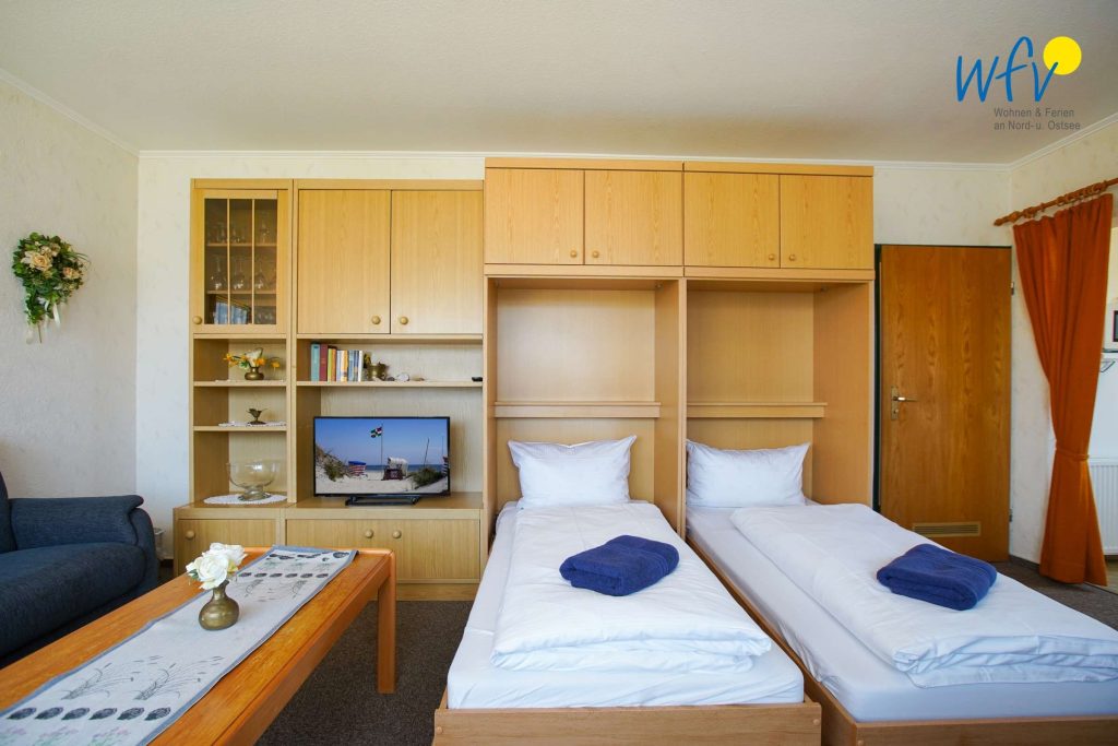 Wenn auf Borkum die Sonne untergeht, bietet Ihnen das separate Schlafzimmer mit Doppelbett (2 x 90 x 190 cm) angenehme Rückzugsmöglichkeiten. Zwei weitere bequeme Schlafplätze bestehen durch das Schrankbett im Wohnraum (2 x 90 x 190 cm).