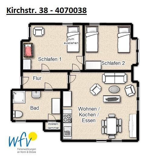 Die Borkumer Ferienwohnung verfügt über zwei separate Schlafräume und bietet damit angenehme Rückzugsmöglichkeiten. Die Zimmer sind mit zwei Einzelbetten bzw. einem ausziehbaren Einzelbett (für zwei Personen) eingerichtet. Weitere Schlafgelegenheiten bestehen durch ein Schlafsofa mit Lattenrost. Auf Wunsch stellen wir Ihnen auch gerne ein Kinderbett in die Ferienwohnung.