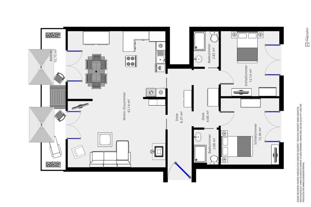 Die Wohnung verfügt über einen großen Wohnraum mit Essbereich und integrierter Küche sowie über zwei separate Schlafräume, zwei Bäder und einen Balkon. Helle Räume, eine liebevolle Einrichtung im modernen Landhausstil und...
